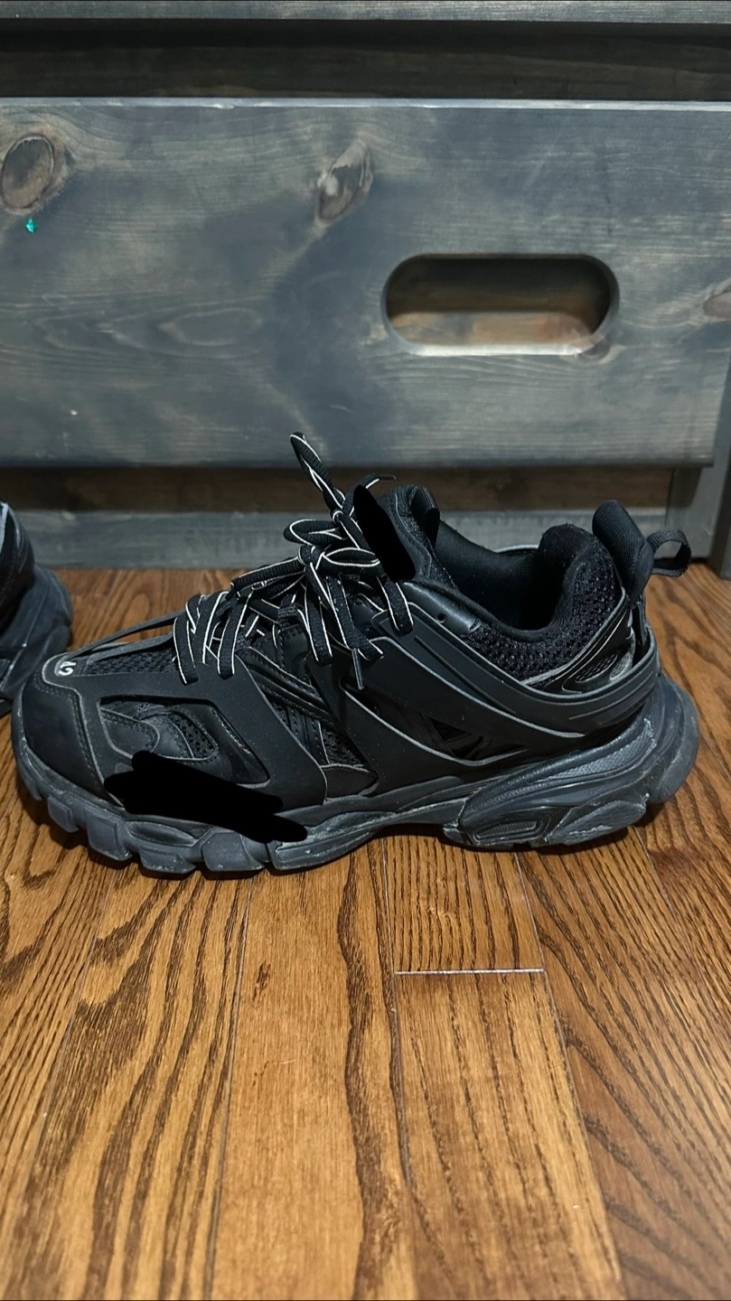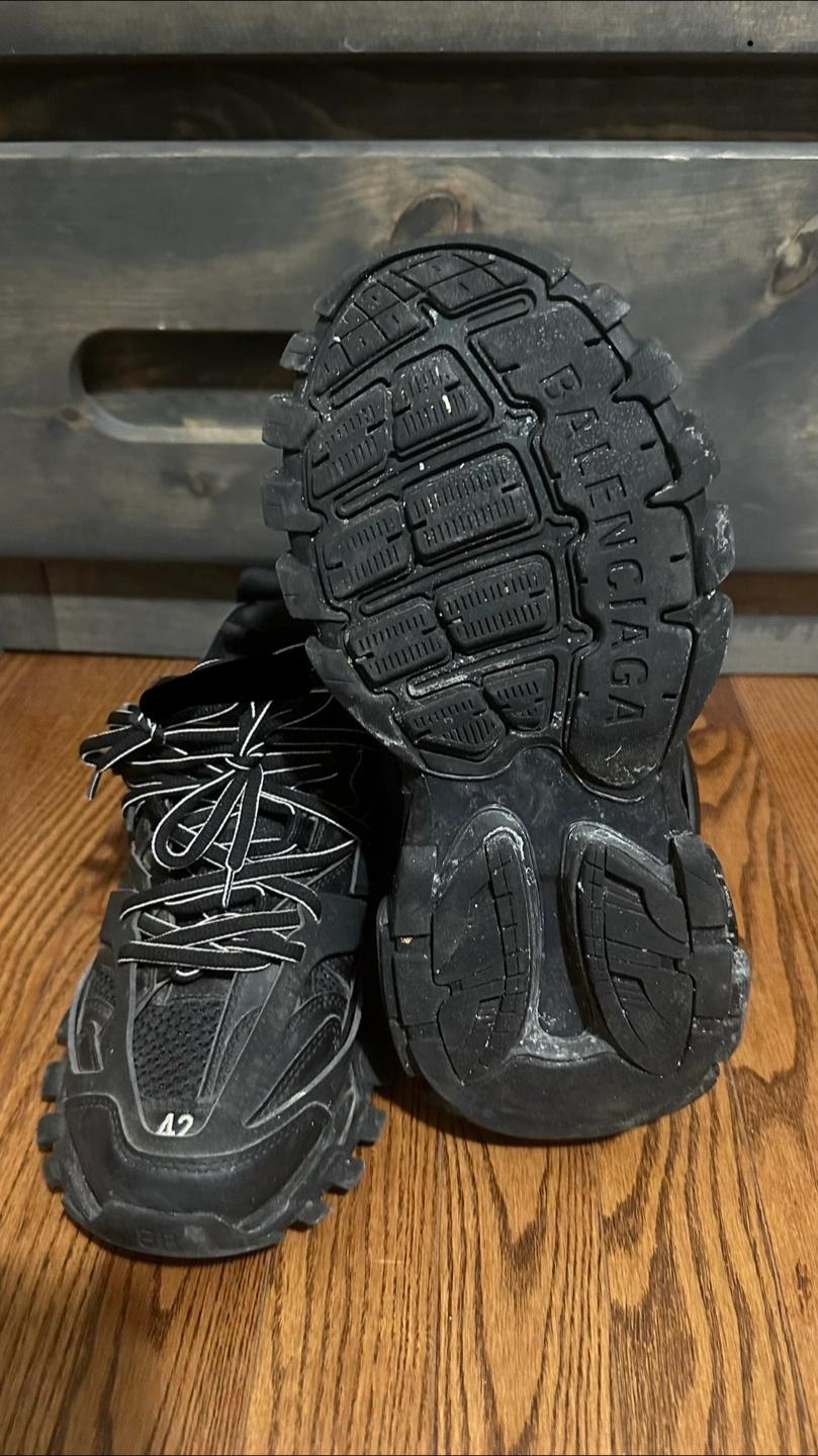 Selling a pair of Balenciaga Track sneakers in black. They are in used condition, with some signs of wear as seen in the photos. Size is US 9, EUR 42. Please take a look at the pictures for details!