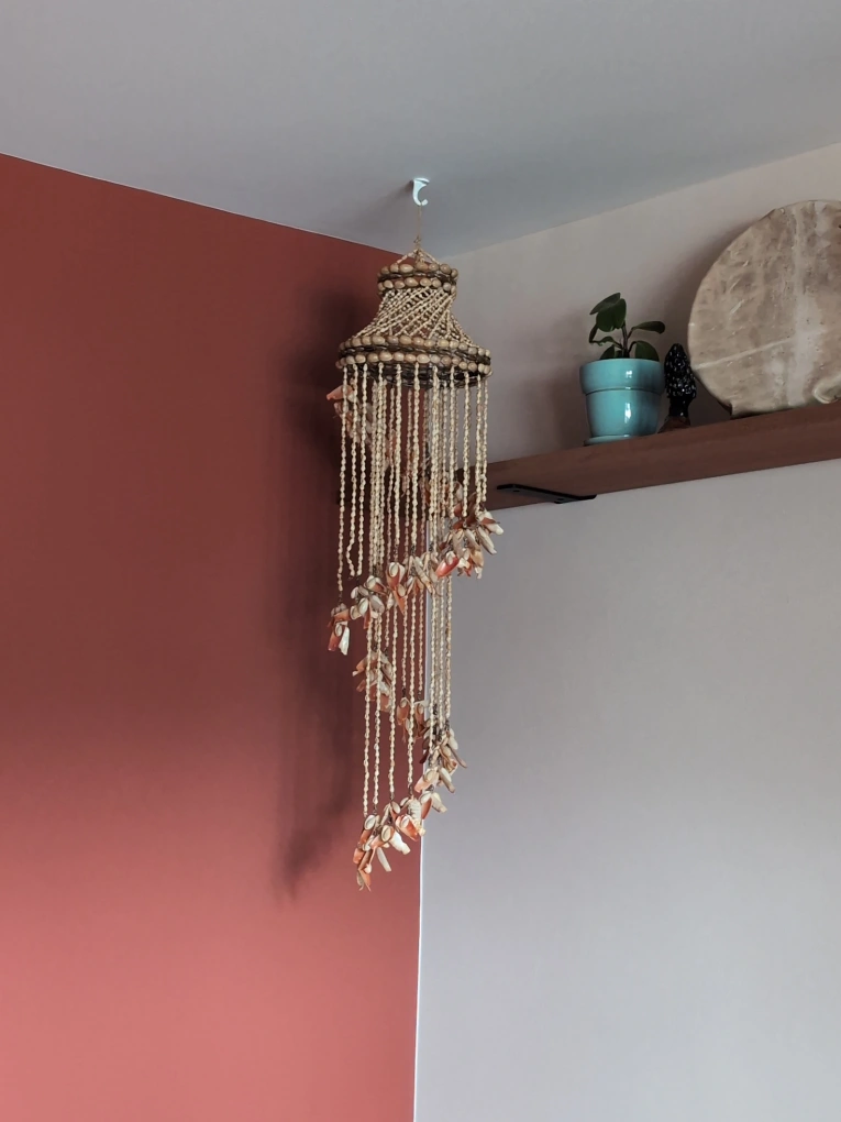 This is a beautiful vintage boho seashell chime mobile, perfect for adding a touch of coastal charm to any room! It features delicate strings of seashells that create a soothing and relaxing sound when they gently chime together. Can be hung inside or outside. ** As seen in photo there is one string missing the larger shells. it is barely noticeable when hanging!