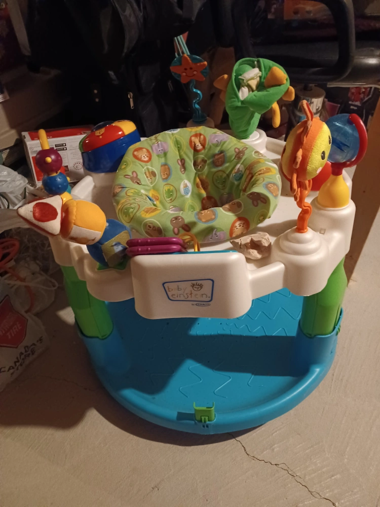 Selling a Baby Einstein activity jumper. It's in great condition and ready for a new home! Also included is a ride-on toy for toddlers. Perfect for keeping your little one entertained!