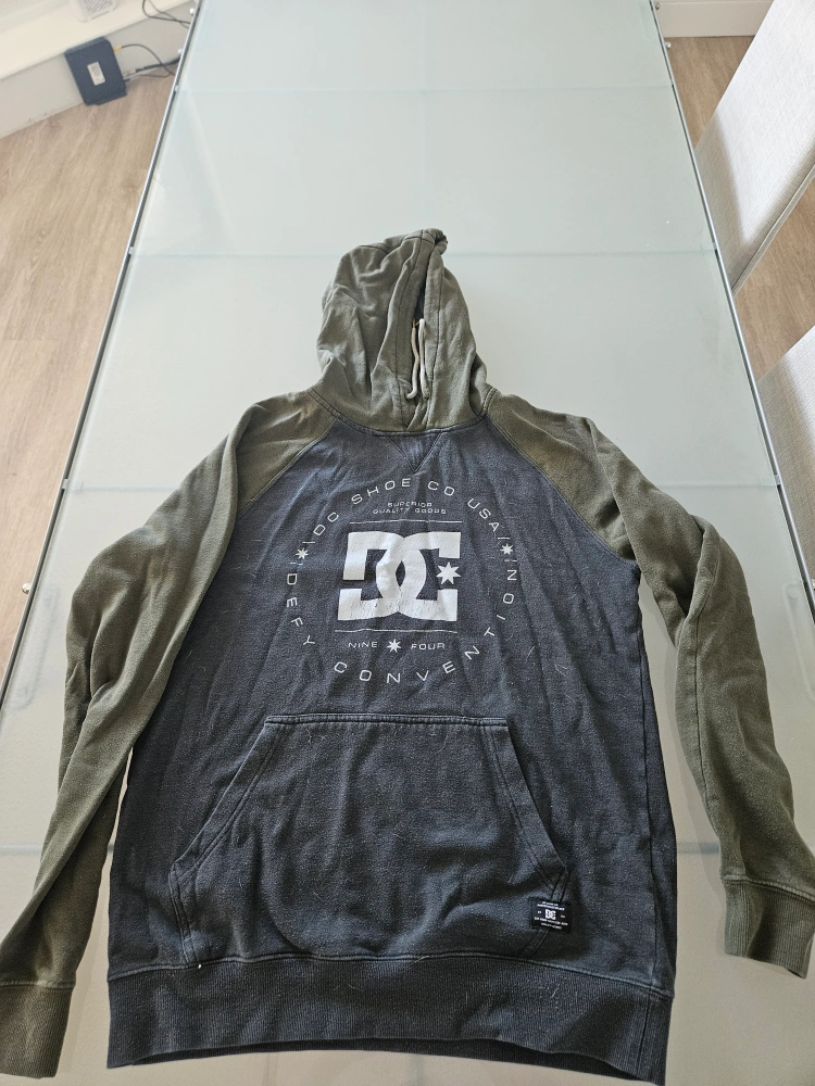 Selling a DC hoodie with a grey body and olive green sleeves and hood. It has a front pocket and the DC logo on the chest. The bottom right has the DC logo on a small tag as well. It's in great condition!
