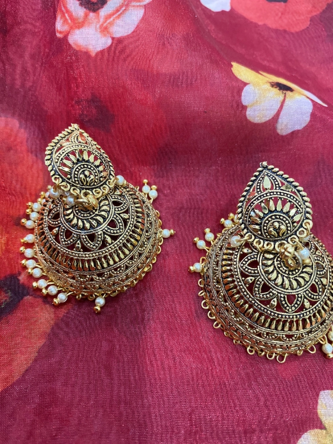 Selling a pair of lovely gold jhumka earrings. They have a beautiful, intricate design and are adorned with small pearl-like beads. Perfect for adding a touch of elegance to any outfit!