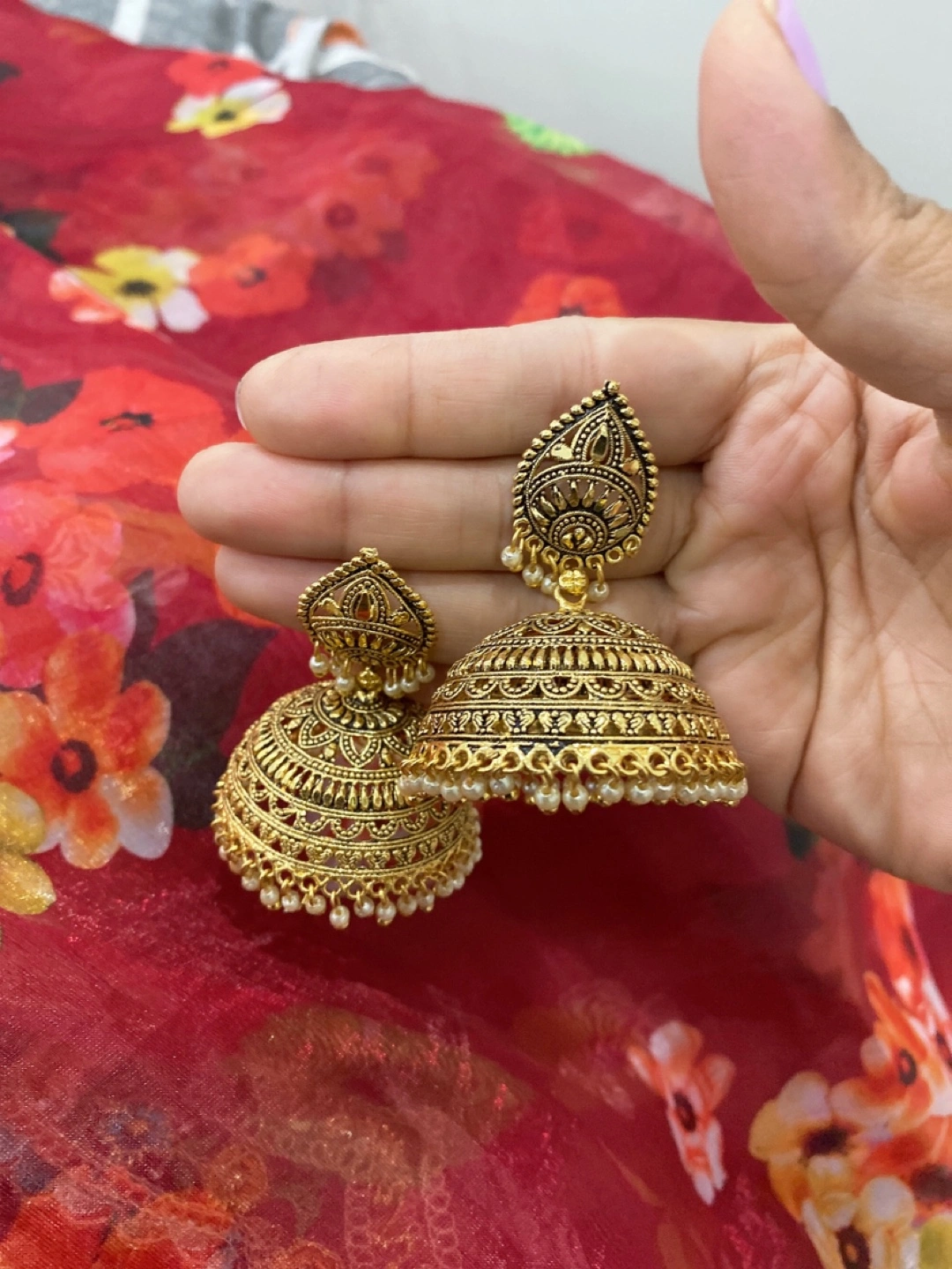 Selling a pair of lovely gold jhumka earrings. They have a beautiful, intricate design and are adorned with small pearl-like beads. Perfect for adding a touch of elegance to any outfit!