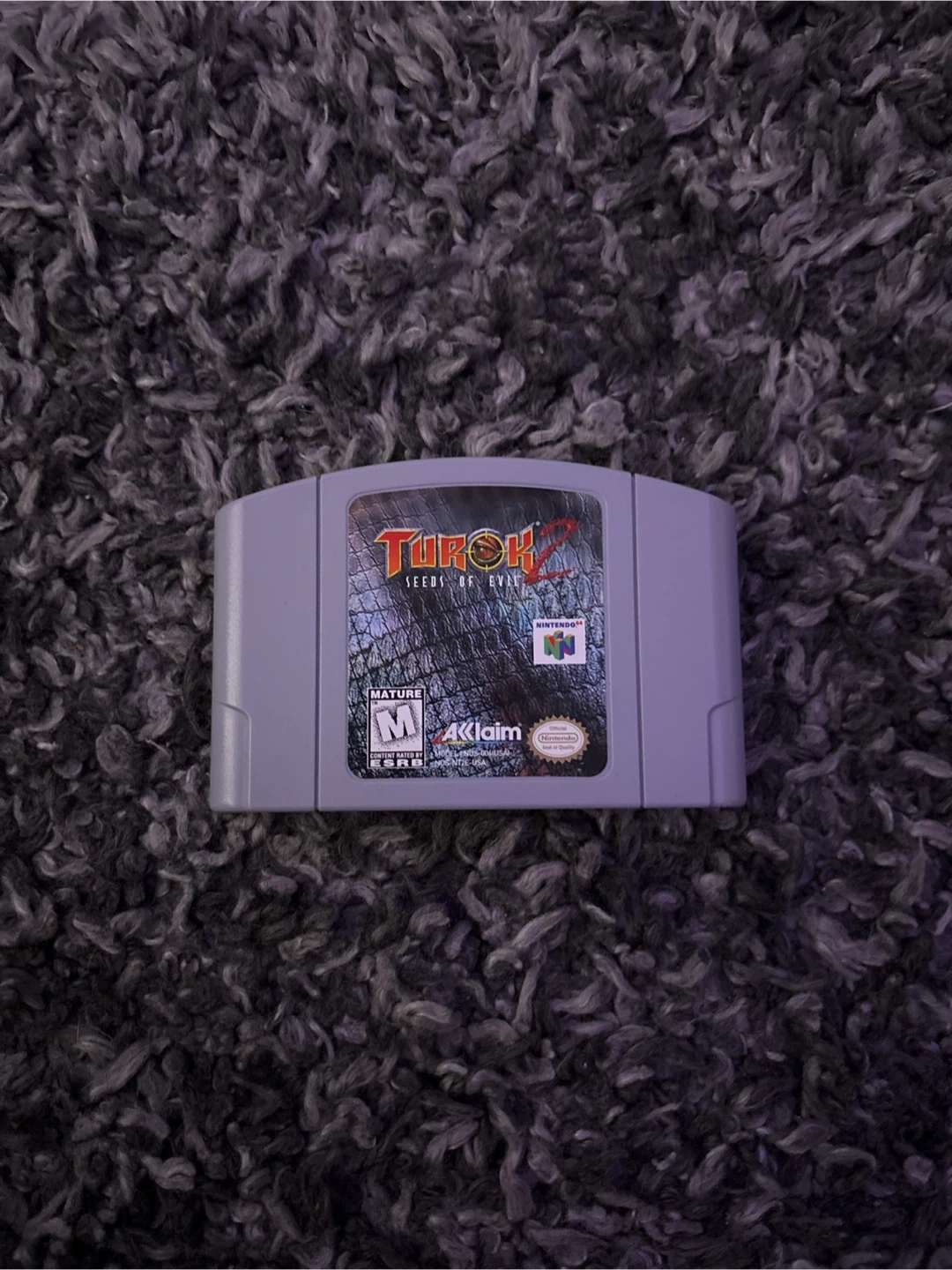This is a Turok 2 Seeds of Evil game cartridge for the Nintendo 64. It's rated M for Mature. Enjoy this classic first-person shooter on your N64 console!