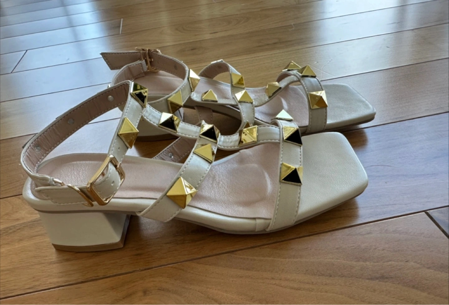 30These are some cute T-strap sandals with a block heel and gold-tone studs. They are a size 35. They look great!