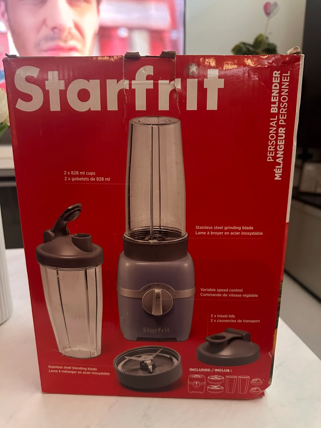 Selling a Starfrit Personal Blender in excellent condition! It includes all removable parts that are dishwasher safe, and features a compact design for easy storage. It also includes quick and healthy recipes. Included are 2 blades and 2 extra-large 828 ml cups, plus 2 travel lids. The blender also has a stainless steel grinding blade and variable speed control. Box included!