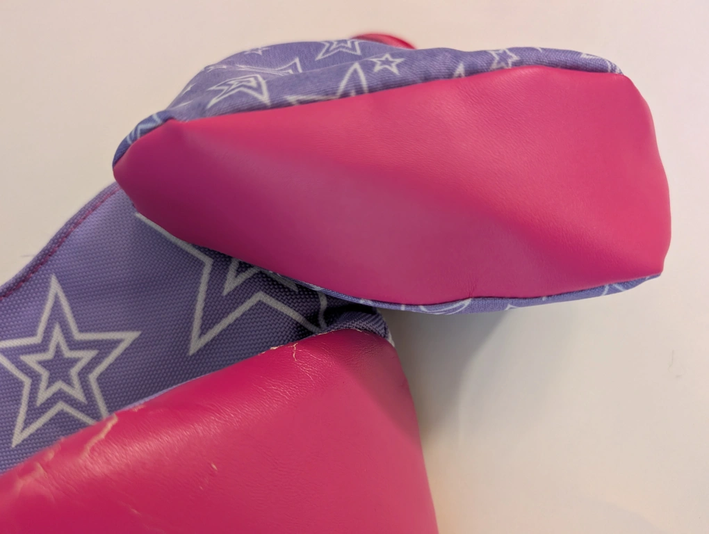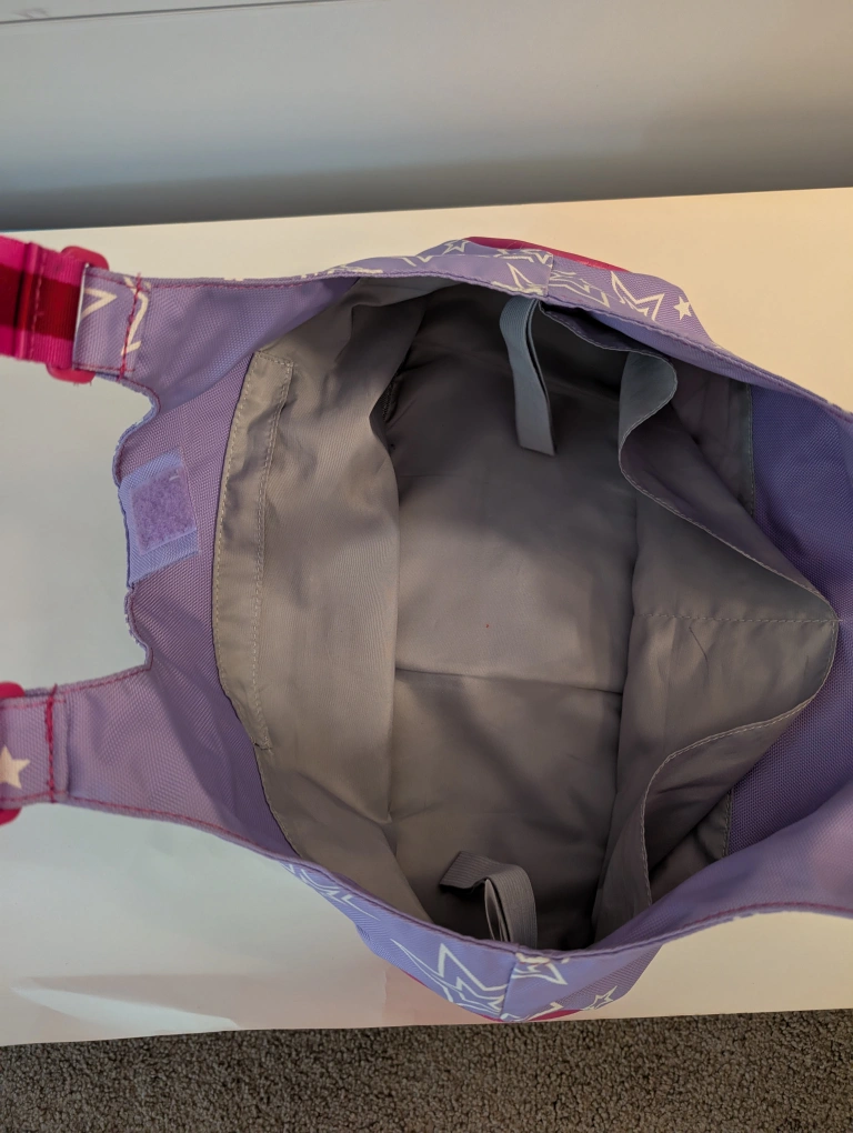 Selling an American Girl tote bag with a star print and a matching mini bag! The tote is purple with white stars and has pink accents. There's some wear and tear on the pink part of the tote, as shown in the photos. Perfect for any American Girl fan!