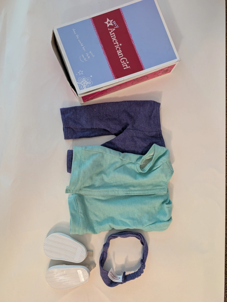 Selling an American Girl outfit that comes with its original box! The set includes a cute top, leggings, shoes, and a headband. Perfect for any American Girl doll fan!