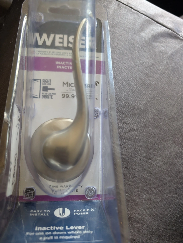 Selling a brand new Weiser inactive lever in satin nickel! It's still in its original packaging and ready to install. This lever is perfect for doors where only a pull is required.