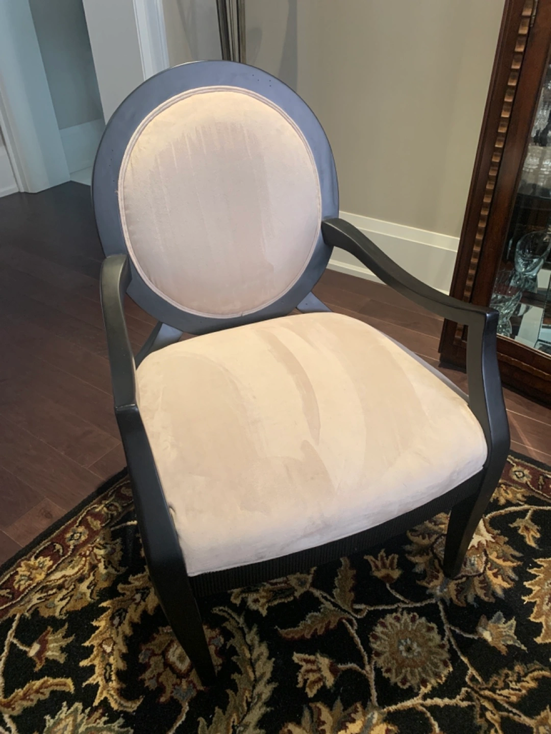 Selling a set of two lovely armchairs with a beige cushion and black frame. It's in good condition and would look great in any living room or bedroom. The chair has a classic design and is very comfortable. Perfect for adding a touch of sophistication to your home!