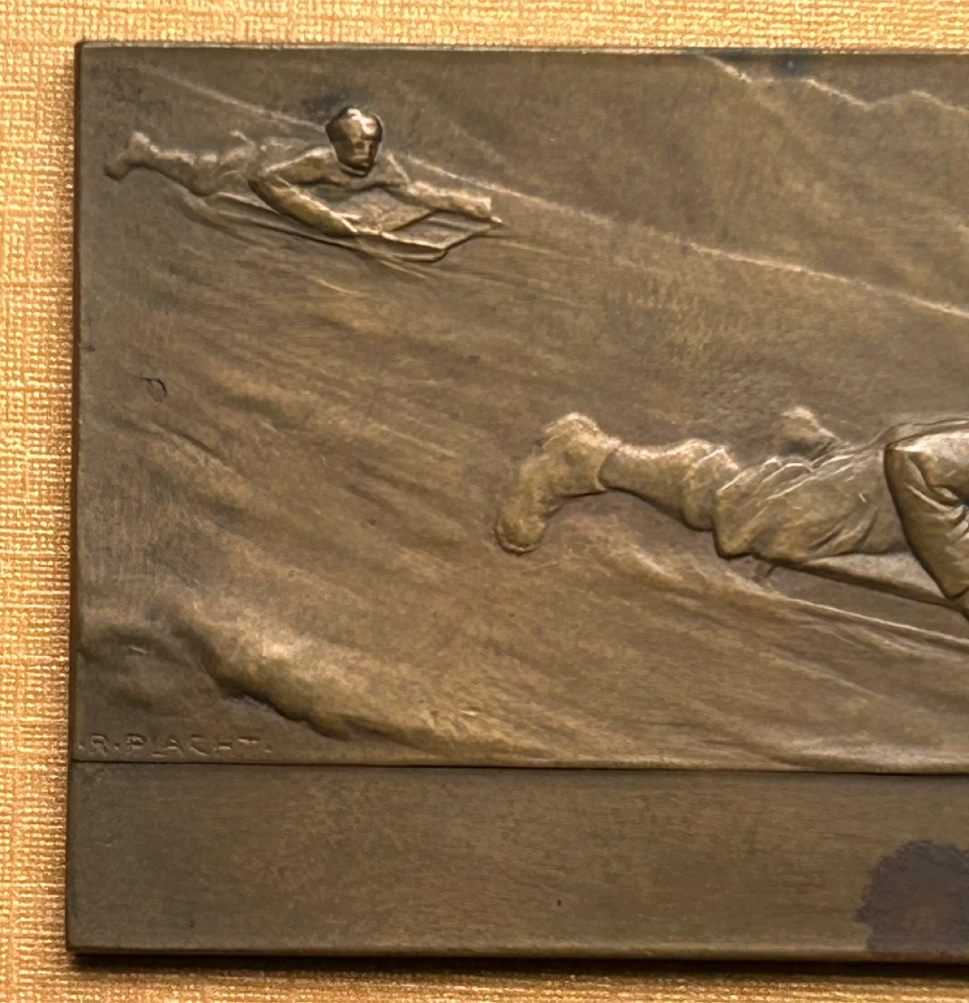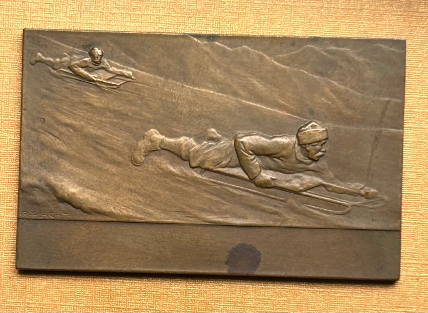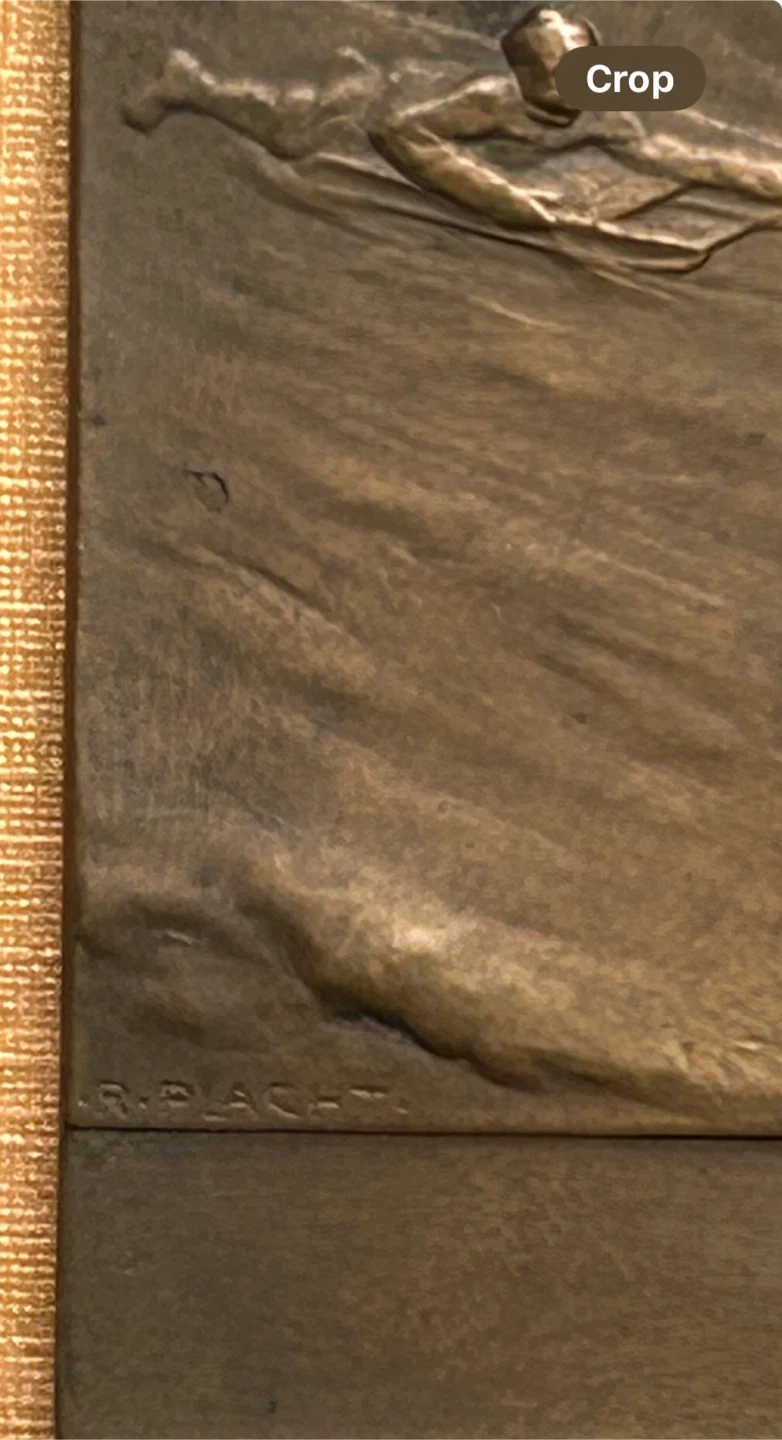 Signed Vienna Bronze men winter sport toboggan art plaque small Antique vintage relief sculpture Lovely small sized Vienna bronze signed Austrian bronze plaque The toboggan winter sled sport one by R Placht BOHEMIAN MEDALIST RICHARD PLACHT (1880-1962) $35 2 1/4 inch x 1 3/8ths inch Elmsdale Road Donlands O'Connor Don mills south exit off DVP