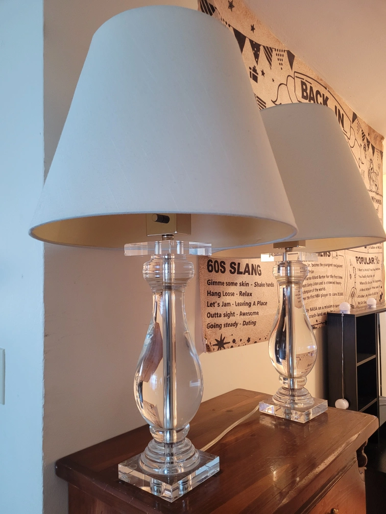 Selling a set of two table lamps. They have a clear, acrylic base and a neutral-toned shade. They would look great in a living room or bedroom. Very heavy!