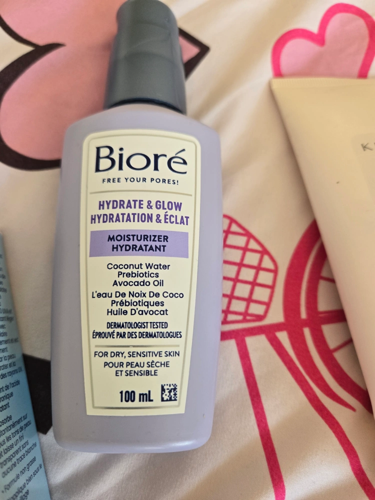 I'm selling a Bioré Hydrate & Glow Moisturizer! It's for dry, sensitive skin and contains coconut water, prebiotics, and avocado oil. It's dermatologist tested and comes in a 100ml bottle