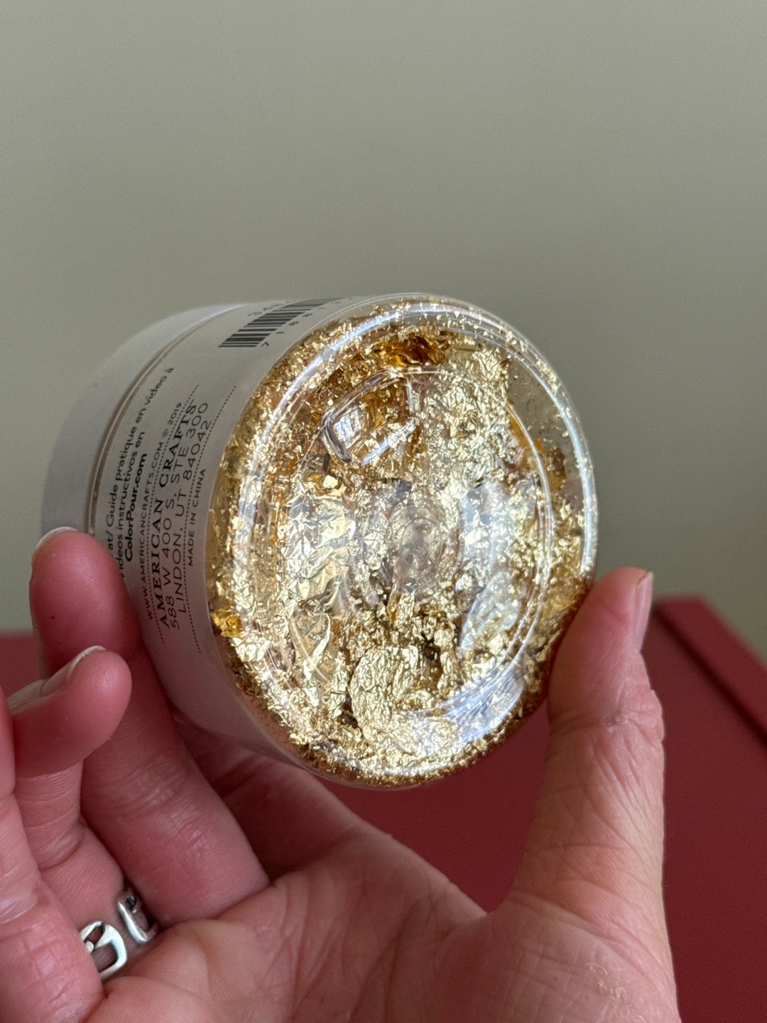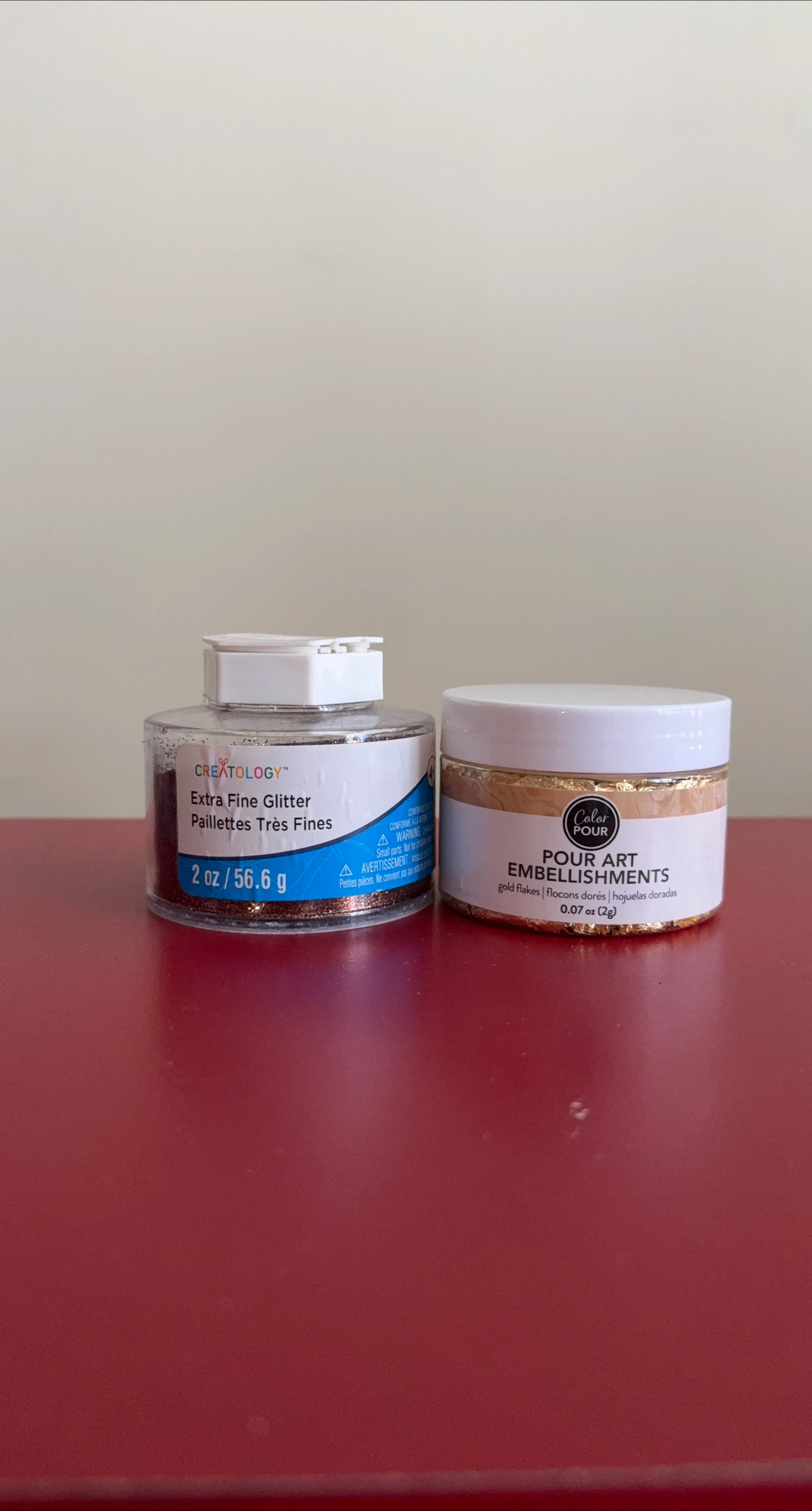 The Creatology glitter is in a 2 oz / 56.6 g container. The Pour Art Embellishments are gold flakes in a 0.07 oz container, both gently used and have 95% of their original contents inside.