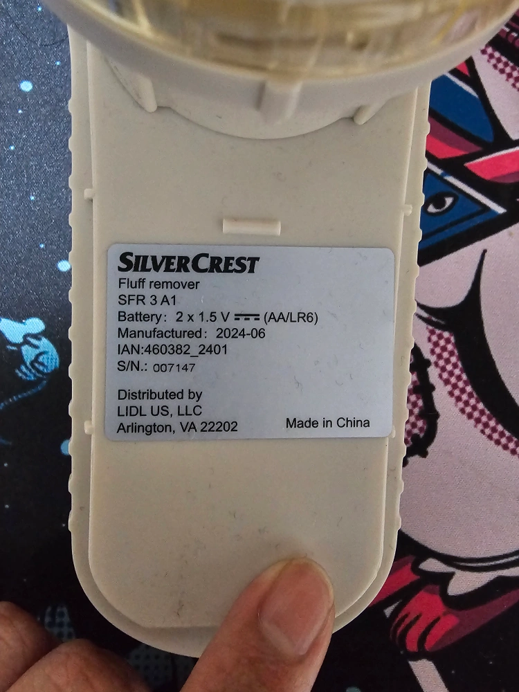 Selling a SilverCrest fluff remover, model SFR 3 A1. It requires 2 x 1.5 V (AA/LR6) batteries. It was manufactured in June 2024.