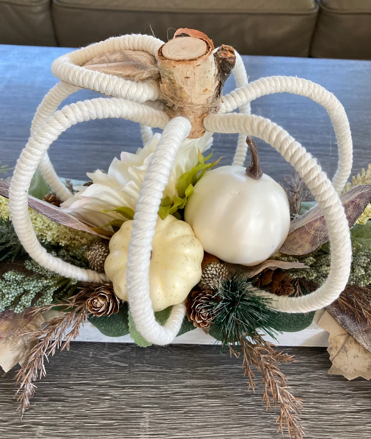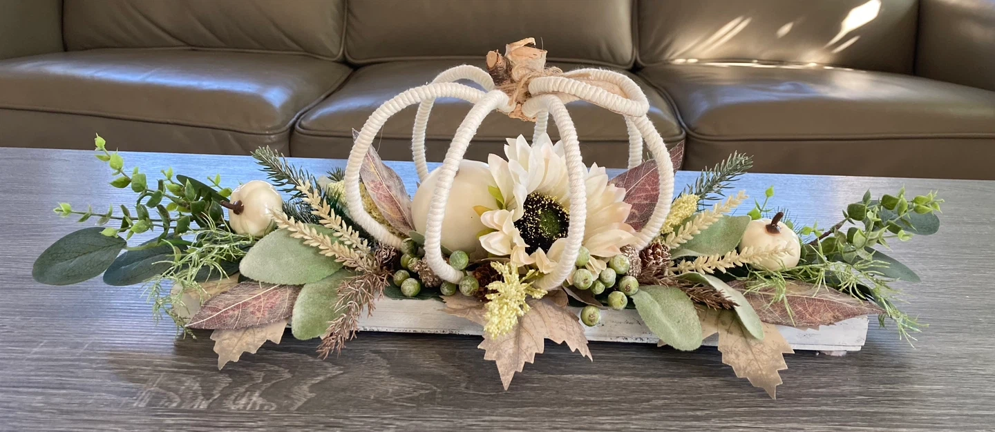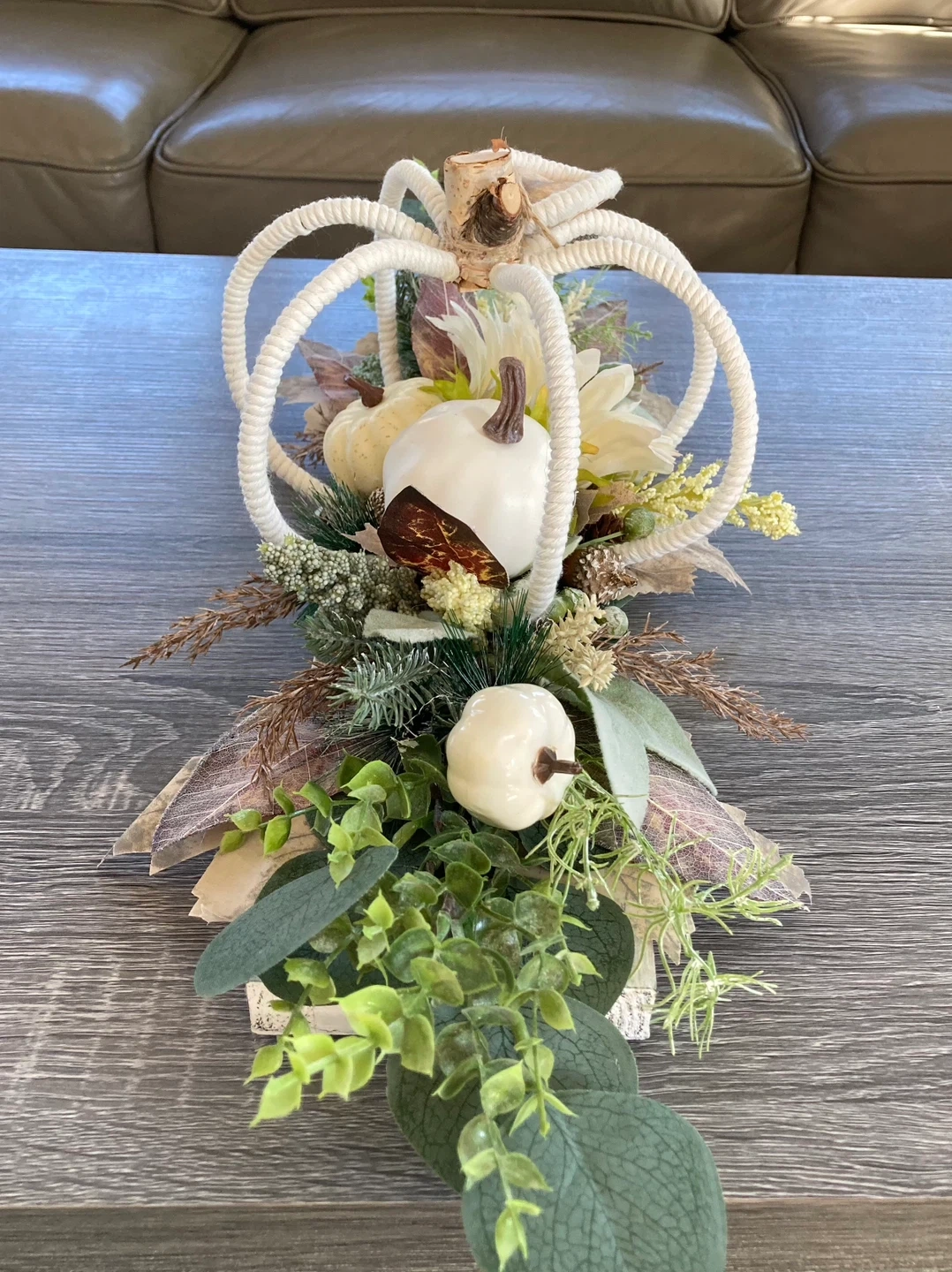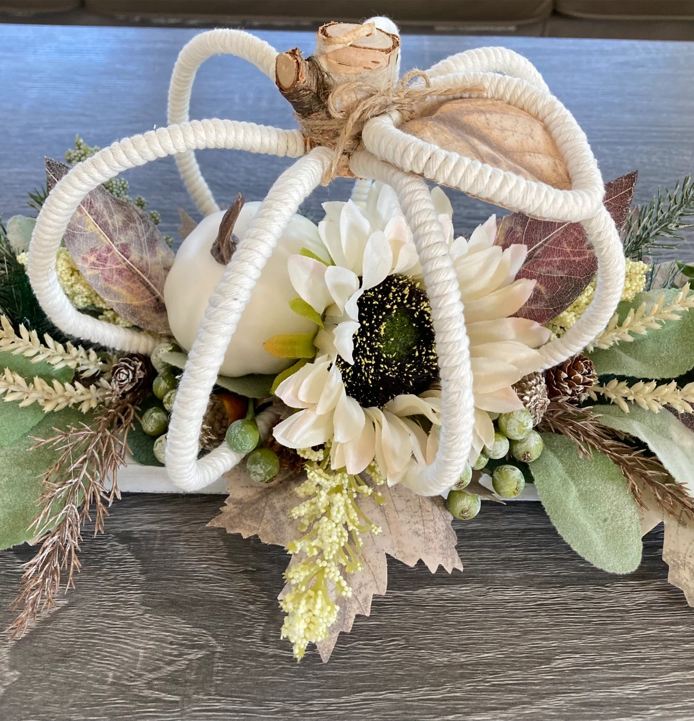 🍁Pumpkin Shape Fall Table Centrepiece Approx. 22” wide by 7” tall by 7” deep White rustic painted rectangular base holds skeleton pumpkin shape wrapped in white rope with wood stem, artificial sunflowers, pumpkins, wheat, maple leaves, berries, pinecones, acorns, and greenery. Please follow the link below for more. Thanks. Facebook page: Artizanna https://www.facebook.com/profile.php?id=100073692274142 Or Instagram: @artizanna__