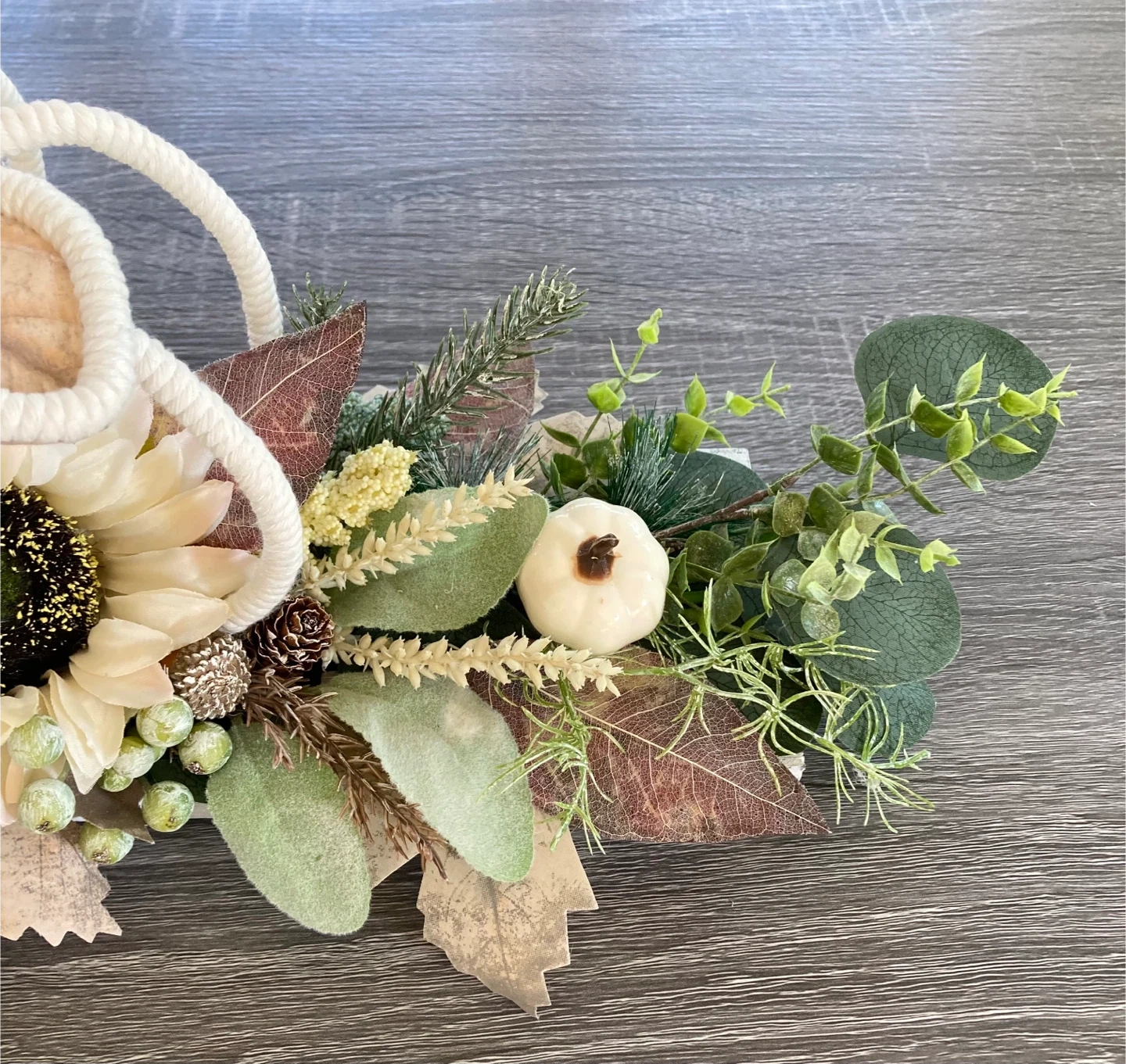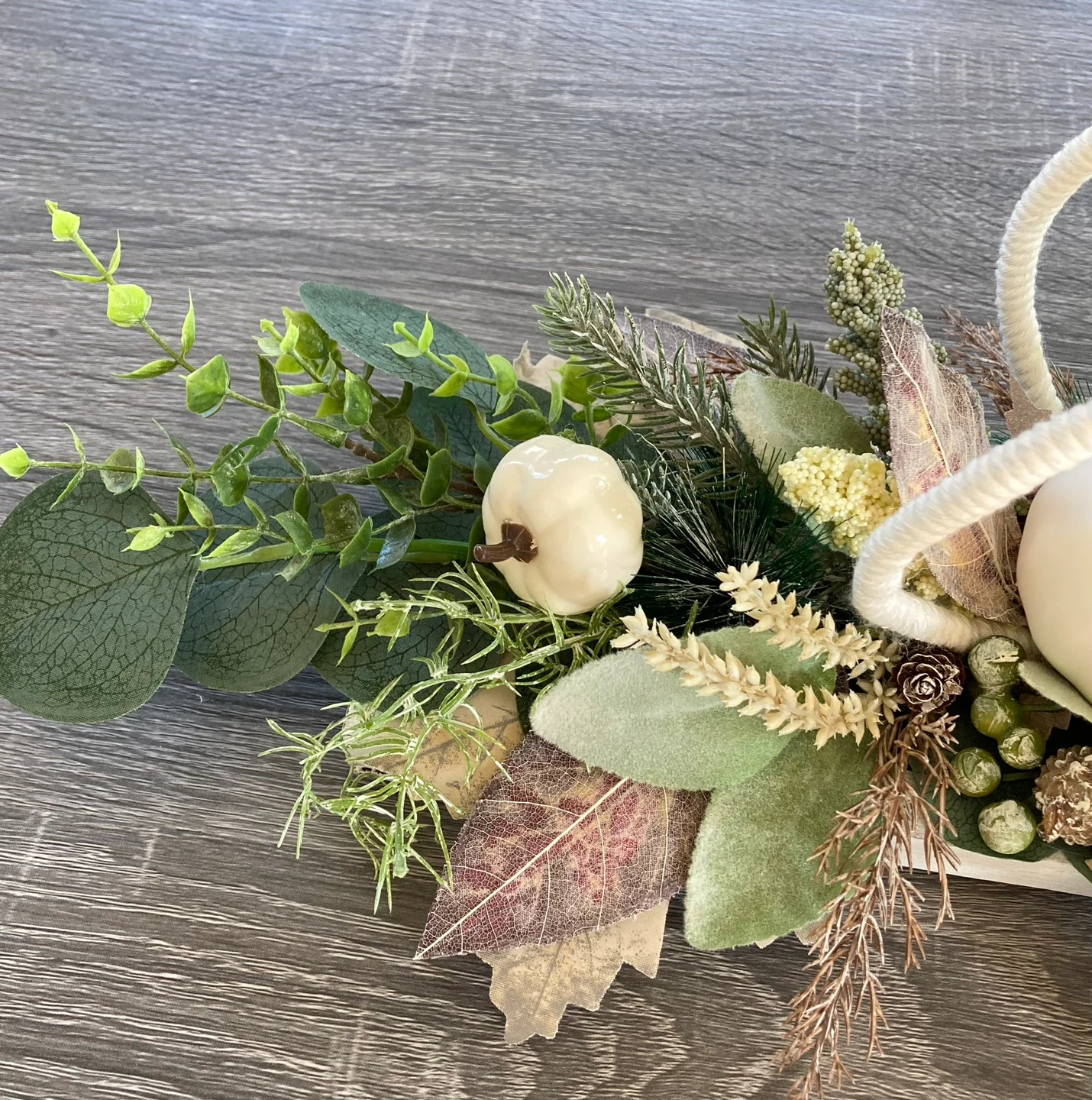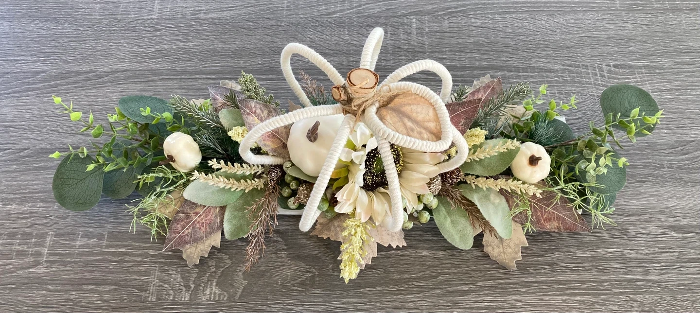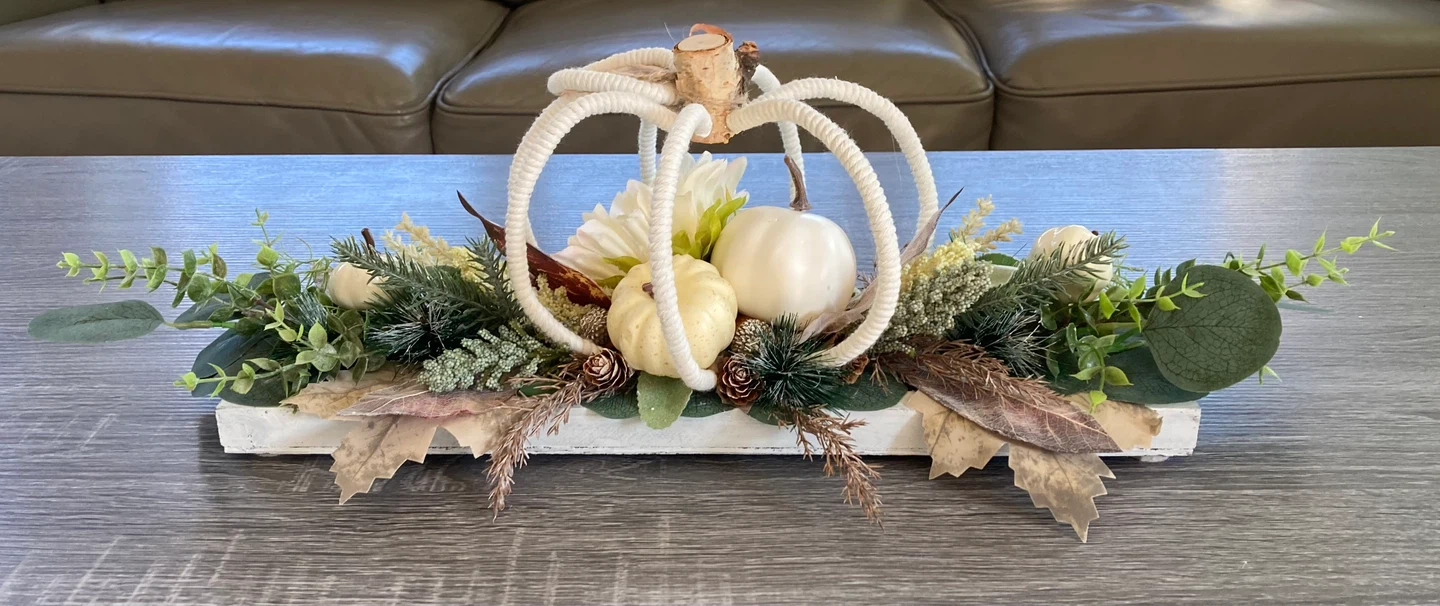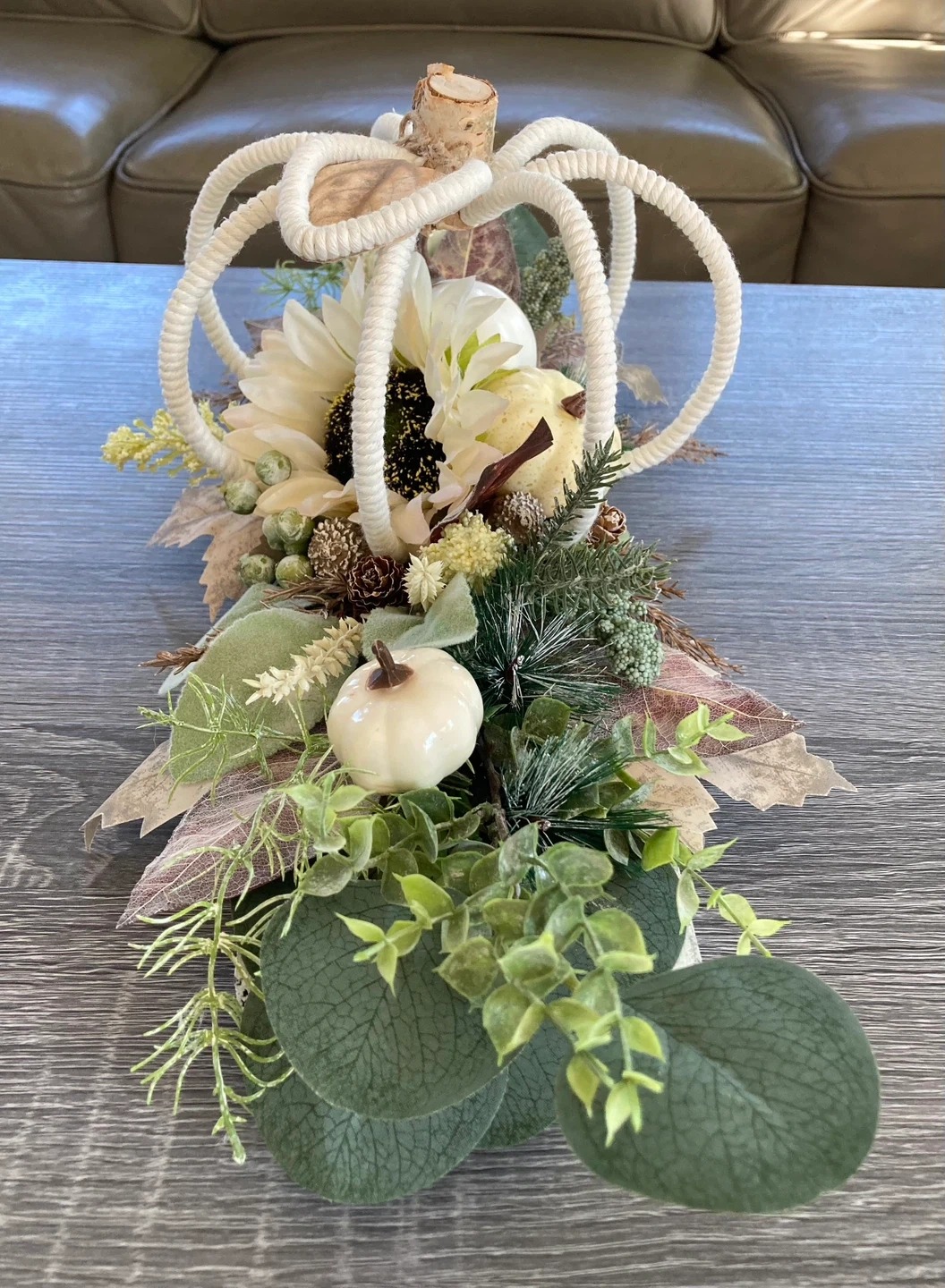 🍁Pumpkin Shape Fall Table Centrepiece Approx. 22” wide by 7” tall by 7” deep White rustic painted rectangular base holds skeleton pumpkin shape wrapped in white rope with wood stem, artificial sunflowers, pumpkins, wheat, maple leaves, berries, pinecones, acorns, and greenery. Please follow the link below for more. Thanks. Facebook page: Artizanna https://www.facebook.com/profile.php?id=100073692274142 Or Instagram: @artizanna__