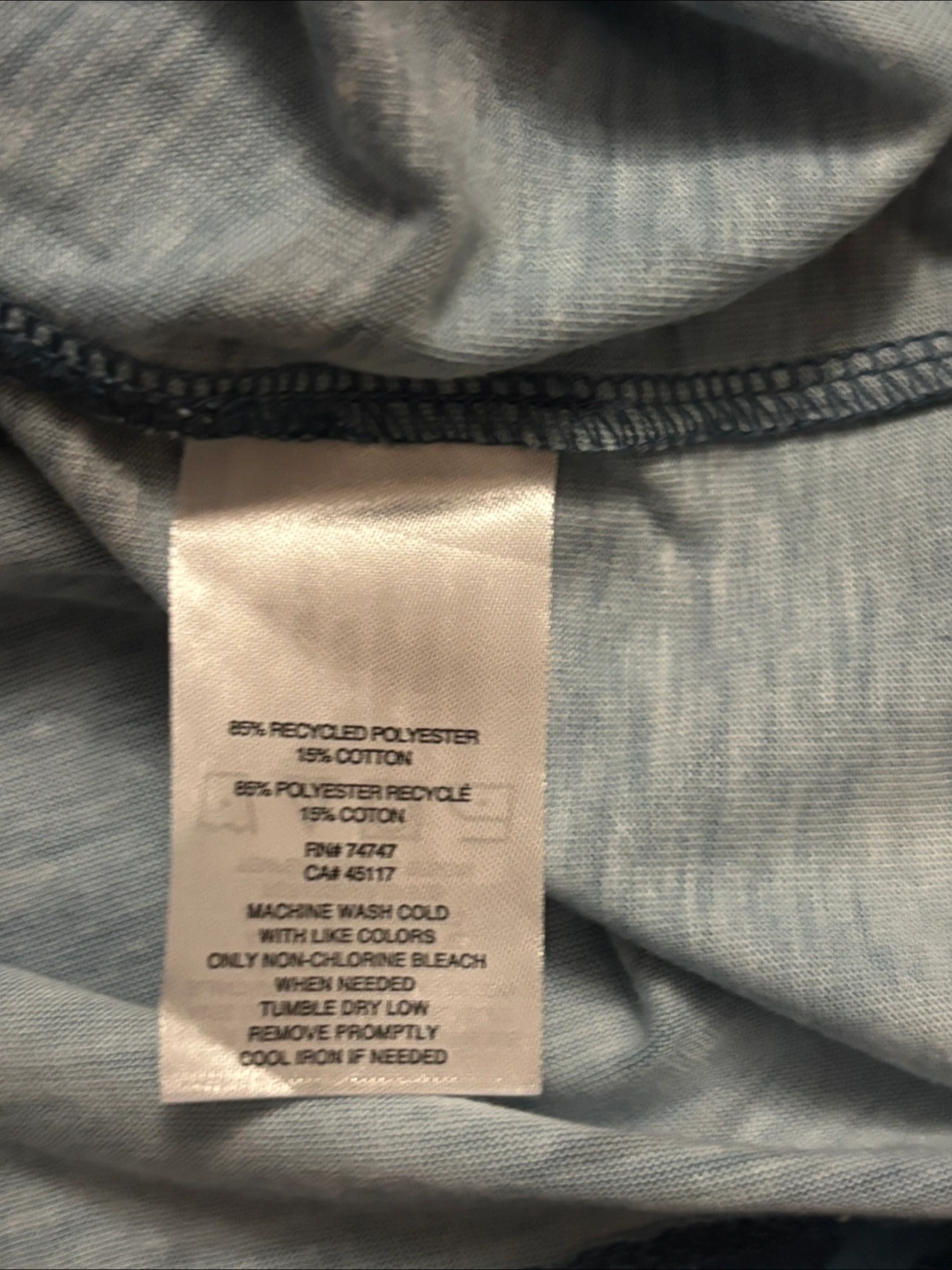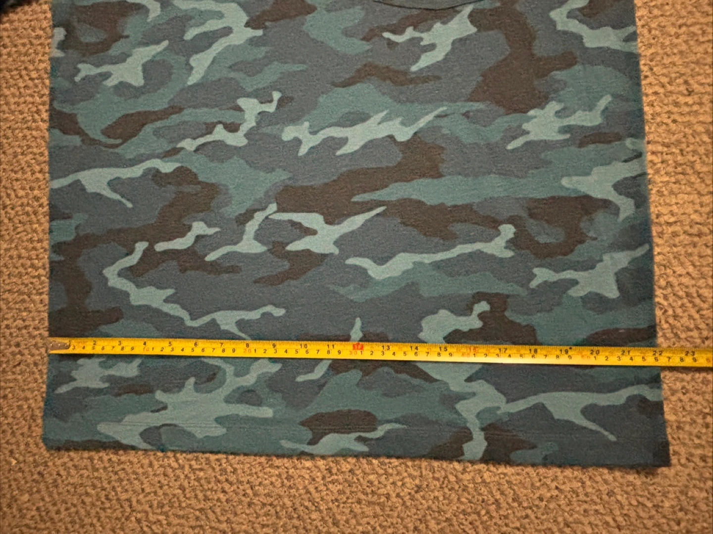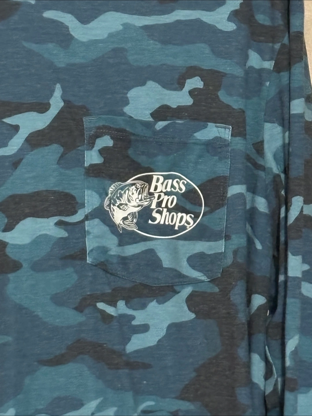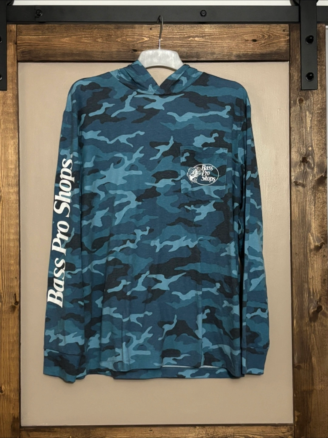 Selling a Bass Pro Shops long-sleeve hoodie in a cool blue camo pattern. It's a size large and made from 85% recycled polyester and 15% cotton.