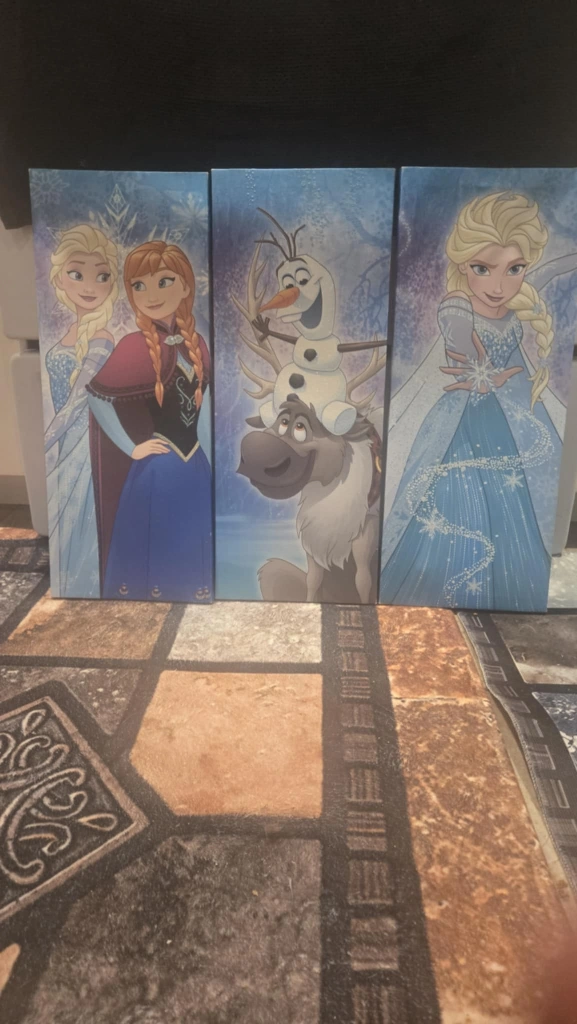 I'm selling a set of three Frozen-themed canvas wall art pieces. Each canvas features characters from the movie, including Elsa, Anna, Olaf, and Sven. Perfect for a kid's room or any Frozen fan!