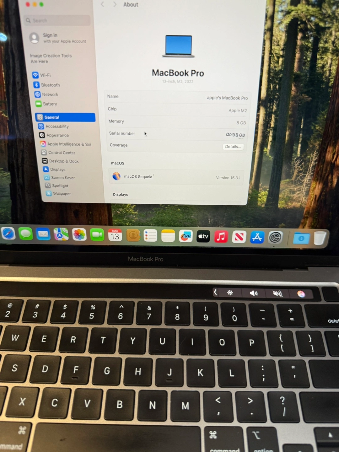Selling a MacBook Pro with the M2 chip! It has 8GB RAM and 256 GB SSD and a 13.3-inch Retina display. The macOS version is Sequoia 15.3.1. The battery's maximum capacity is 100% with a cycle count of 49!