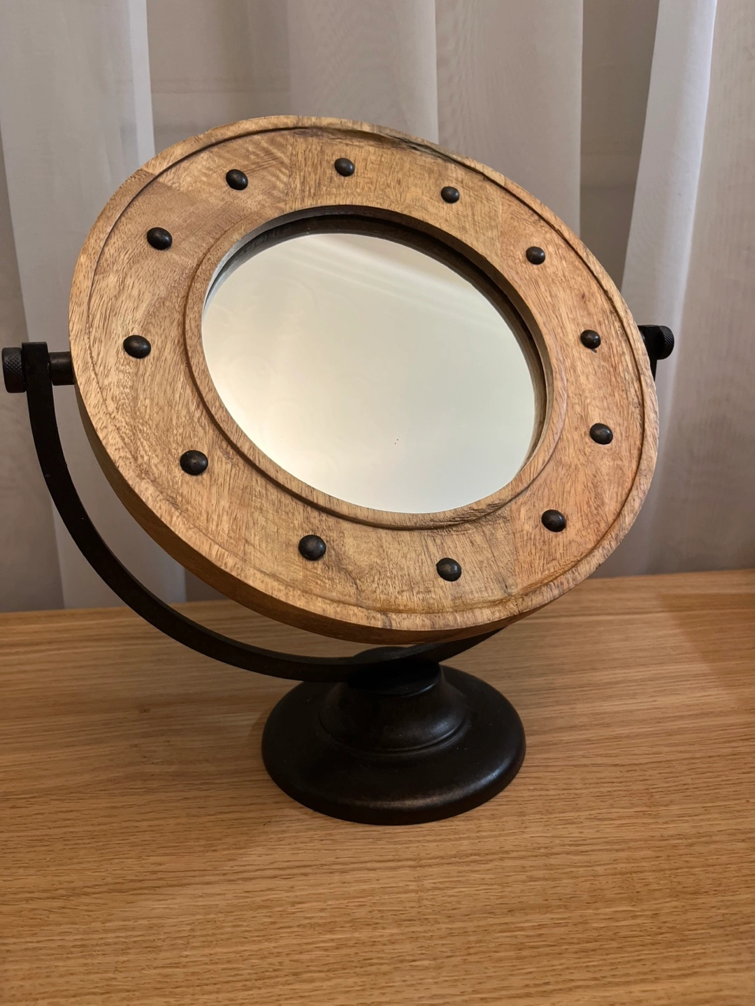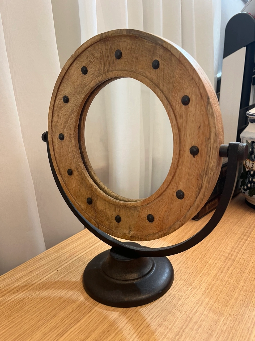 Selling a cute round vanity mirror! It features a wooden frame with black accents and a sturdy black metal base. It would be perfect for a bedroom or bathroom