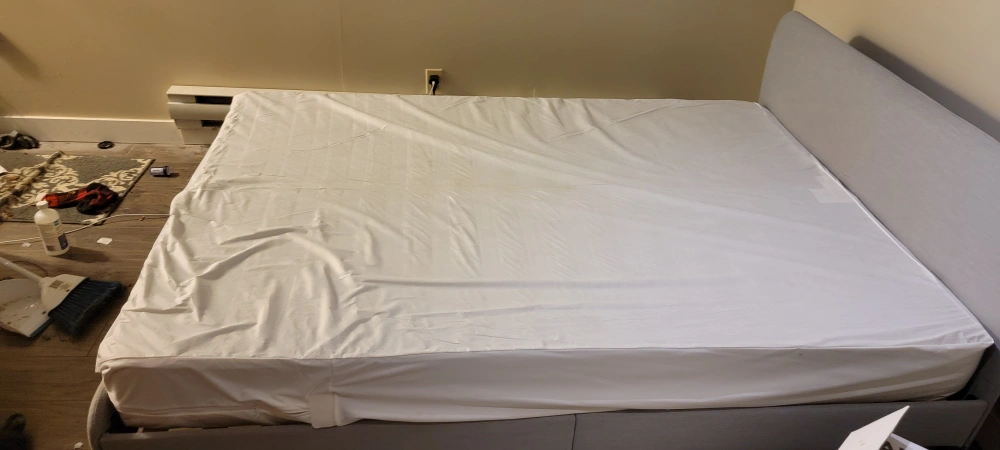 Moving and need it gone Monday or Tuesday morning (18th or 19th AM) - free full size bed frame and mattress in a neutral grey colour. It's in good condition with a firm mattress and ready for a new home. Perfect for adding a touch of modern simplicity to your bedroom!