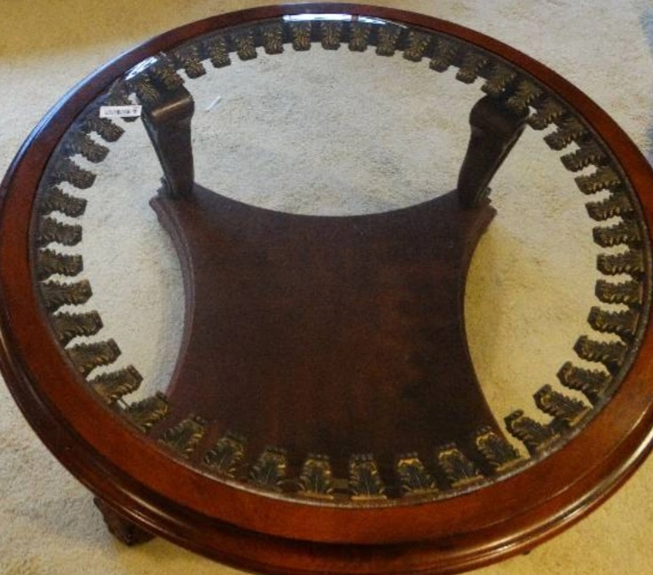 Selling a round coffee table with a glass top and decorative wood trim. It's in good condition and would look great in any living room! willing to negotiate
