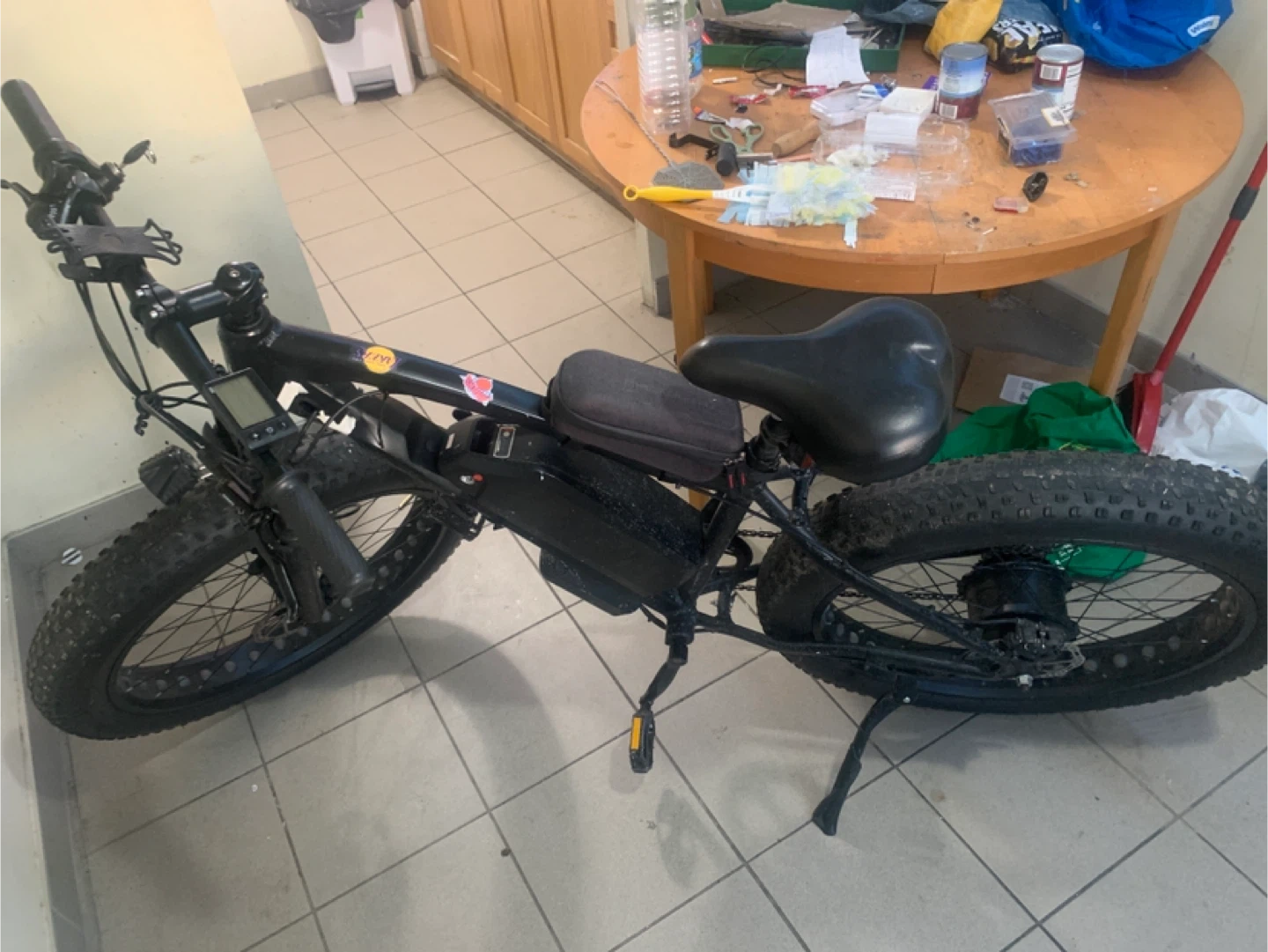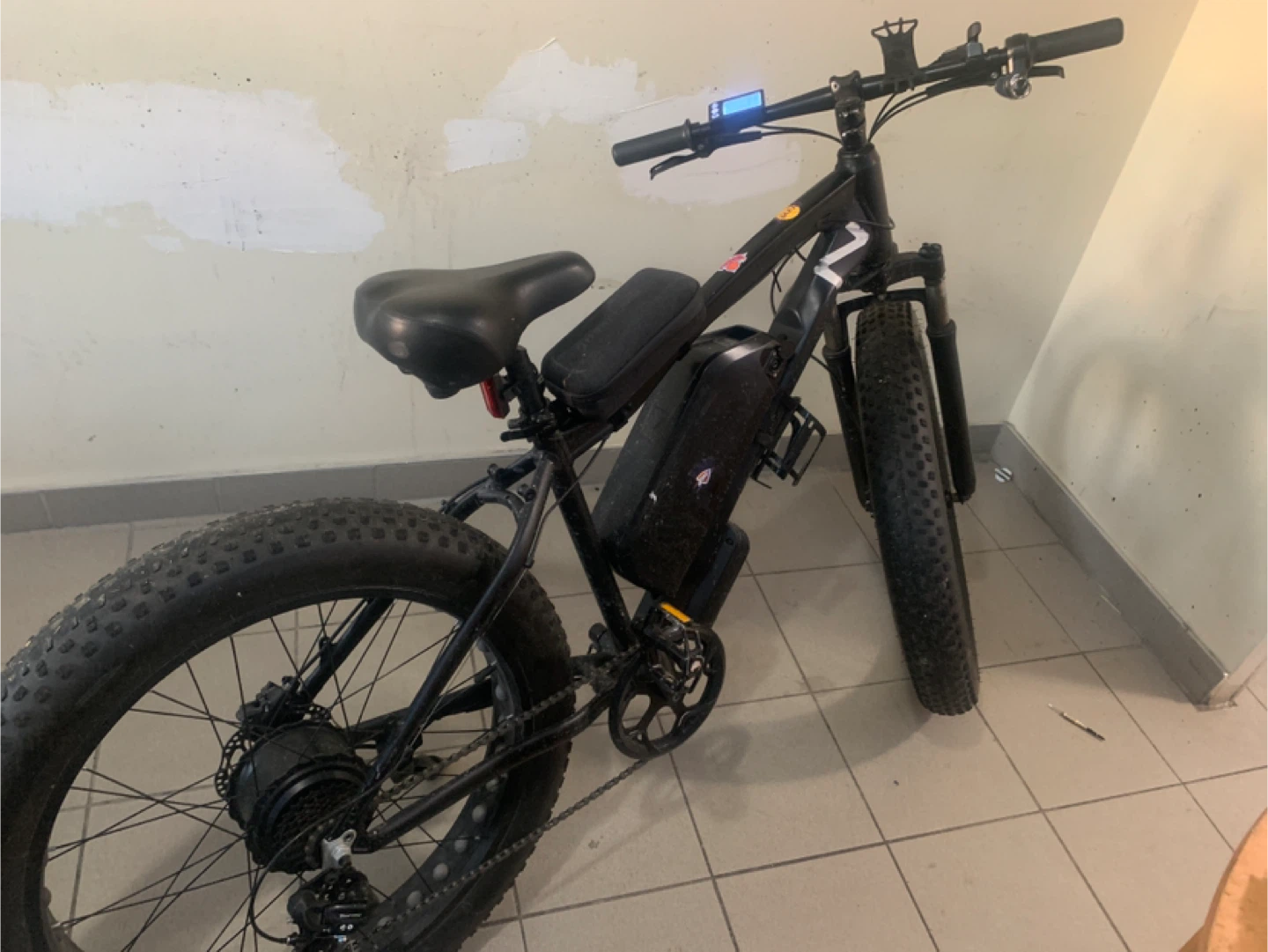 This is a black electric fat tire bicycle. It has a powerful motor and a large battery pack. The fat tires provide excellent traction on various terrains. It's perfect for off-road adventures or commuting in snowy or sandy conditions!