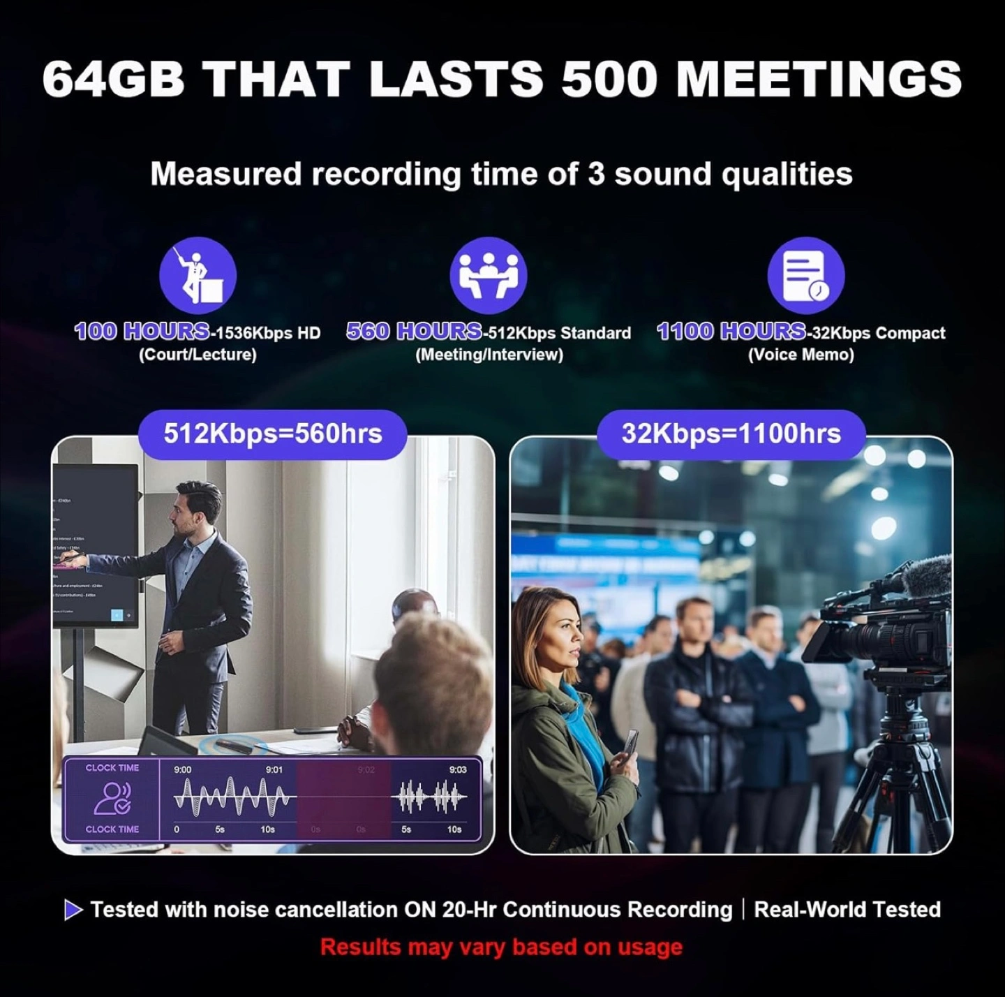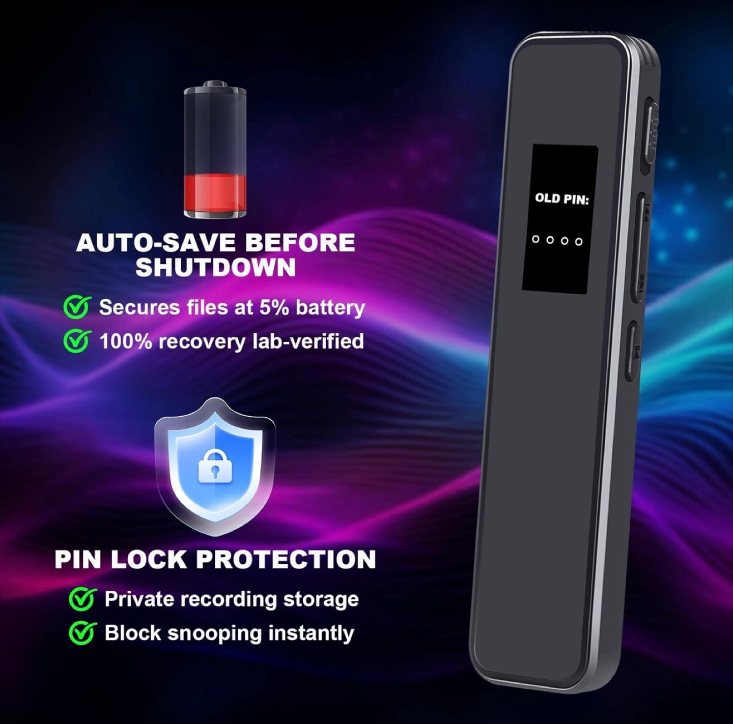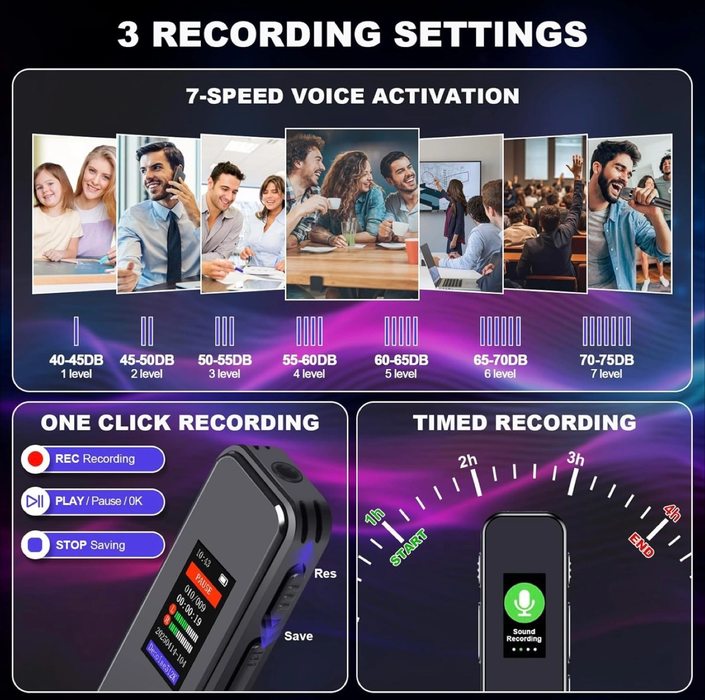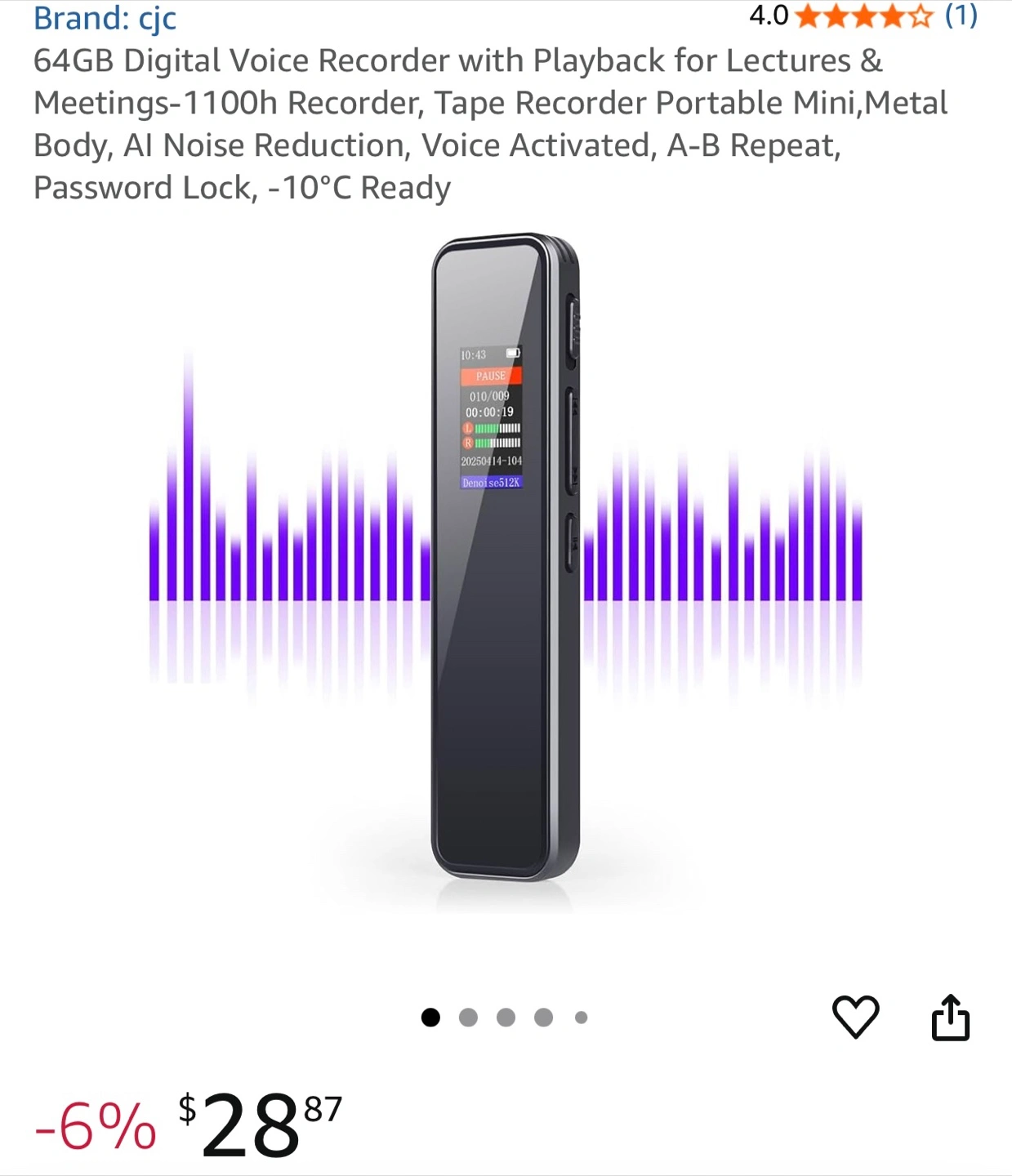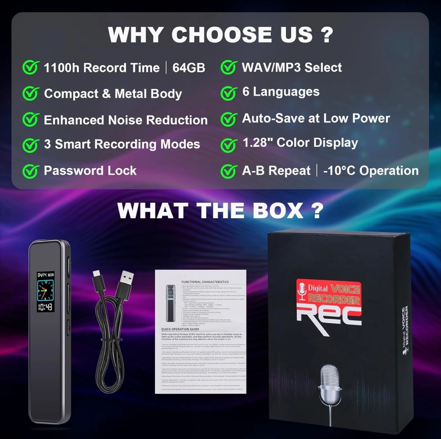 265Selling a CJC digital voice recorder in like-new condition! It's a 64GB digital voice recorder with playback, perfect for lectures and meetings. It can record up to 1100 hours. It's portable and has AI noise reduction, voice activation, and password lock. Comes with the box and charging cable