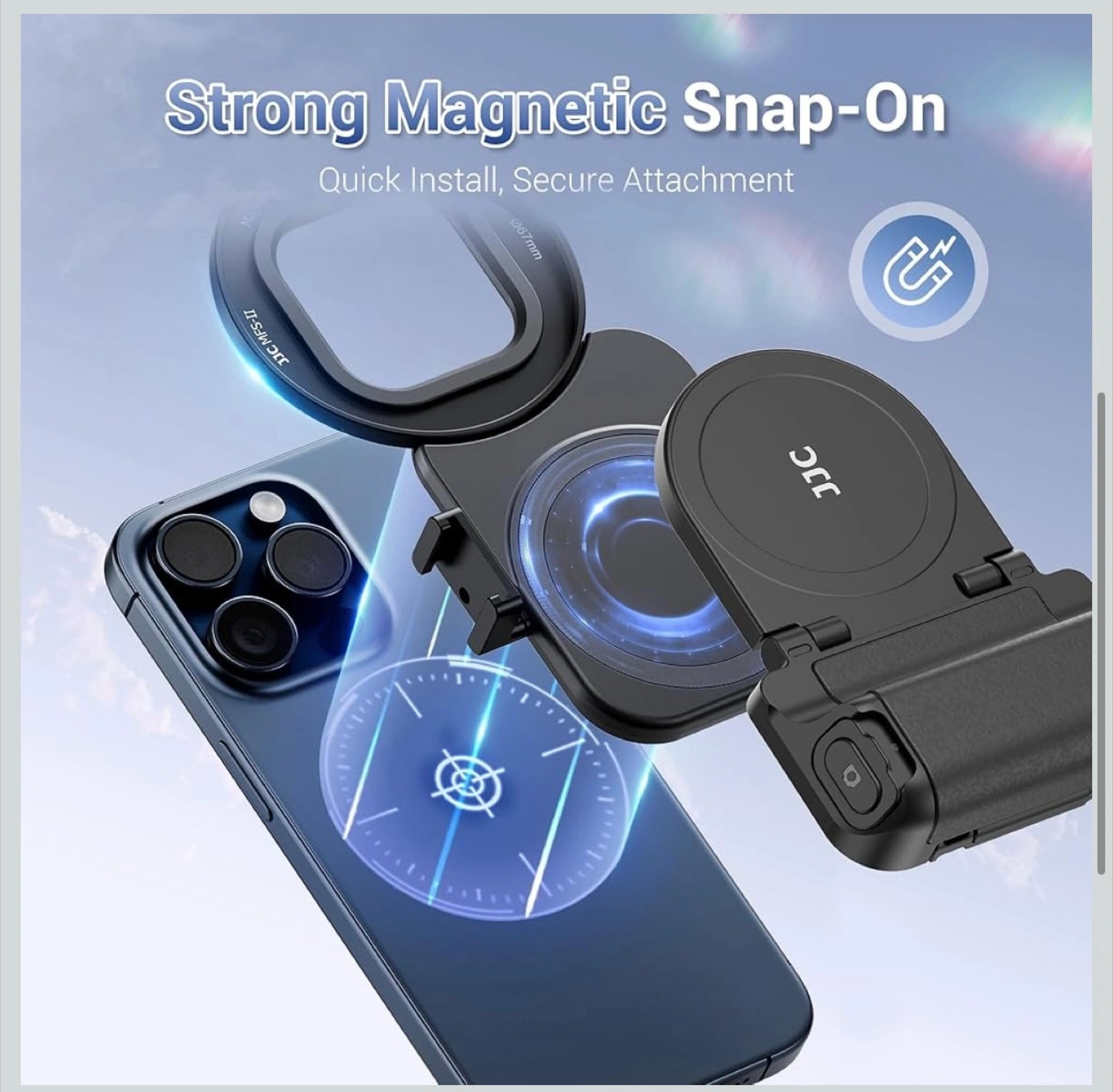 Get the perfect shot with this JJC magnetic phone grip and lens filter adapter system! Compatible with iPhone 16/15/14 Pro/Pro Max models. The kit includes a detachable wireless remote for capturing the perfect moment. Strong magnetic snap-on design ensures quick install and secure attachment. Comes with the original boxes!