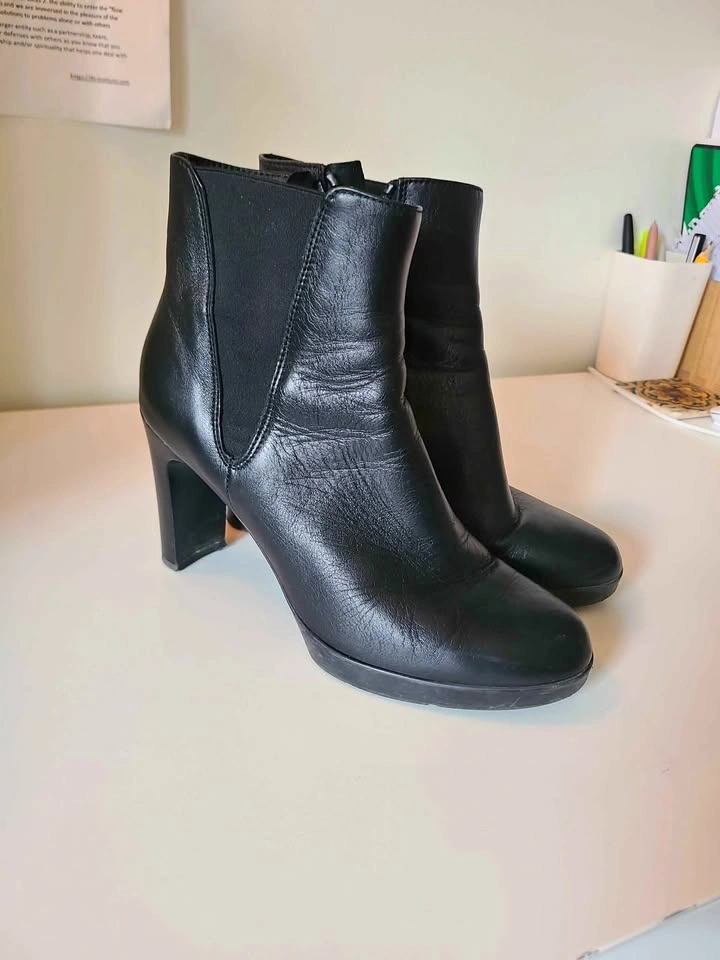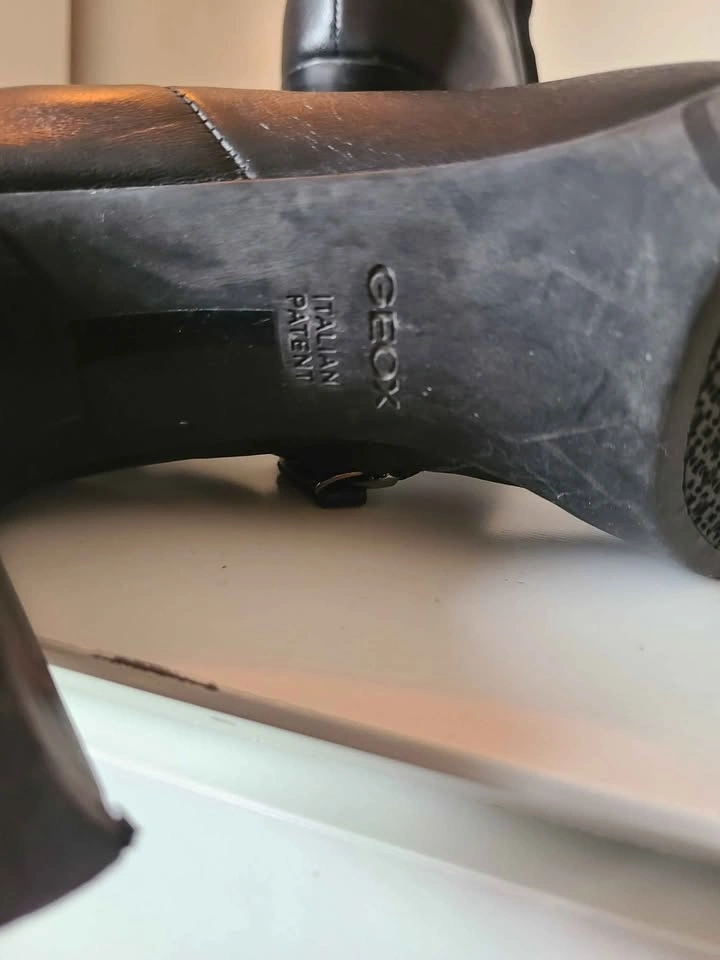 Upgrade your wardrobe with these elegant Geox black leather ankle boots in women’s size 37 (US 6.5-7). These boots feature a sleek leather upper, comfortable block heels (~3-4 inches), and elastic side panels for easy wear.