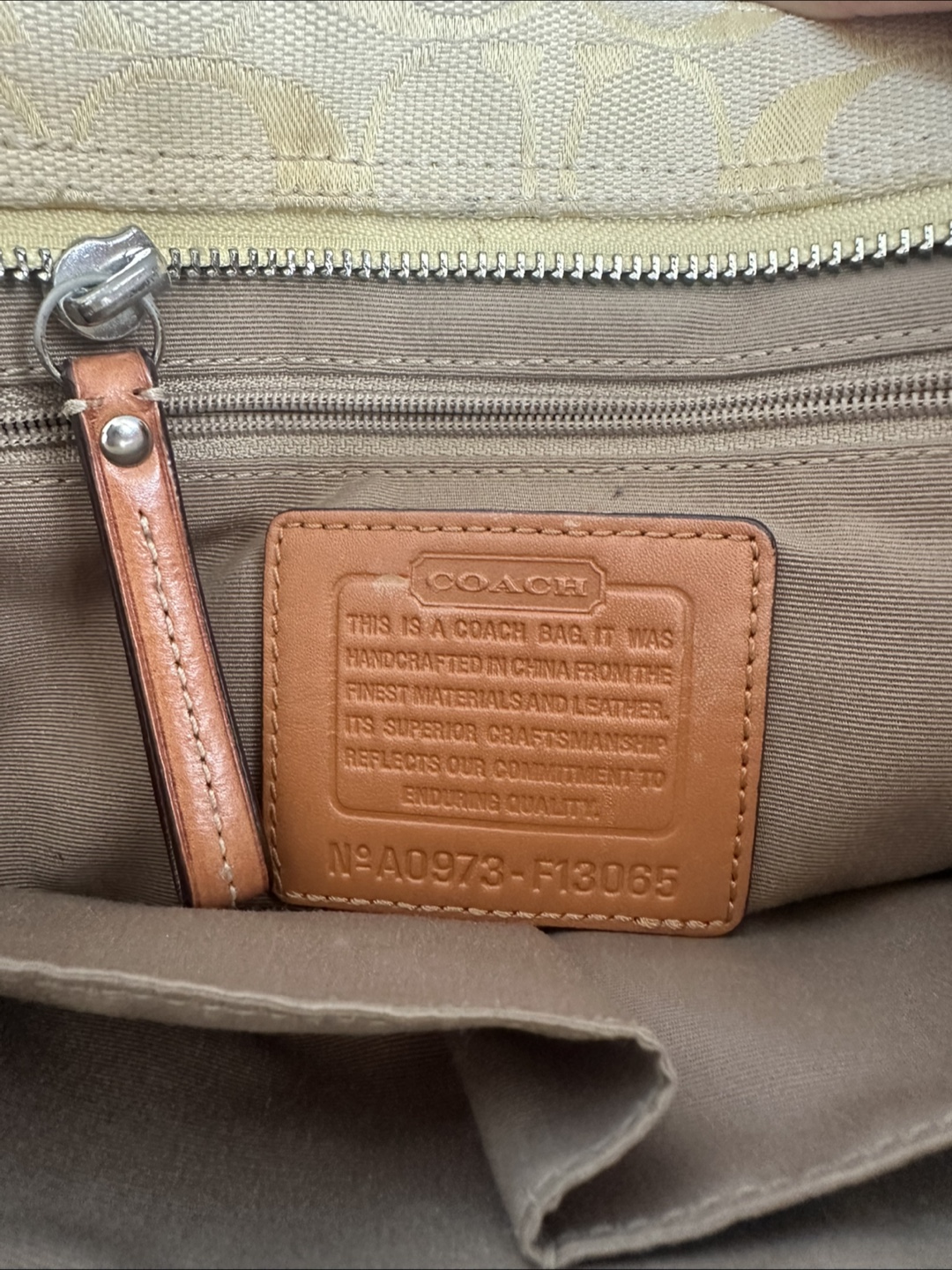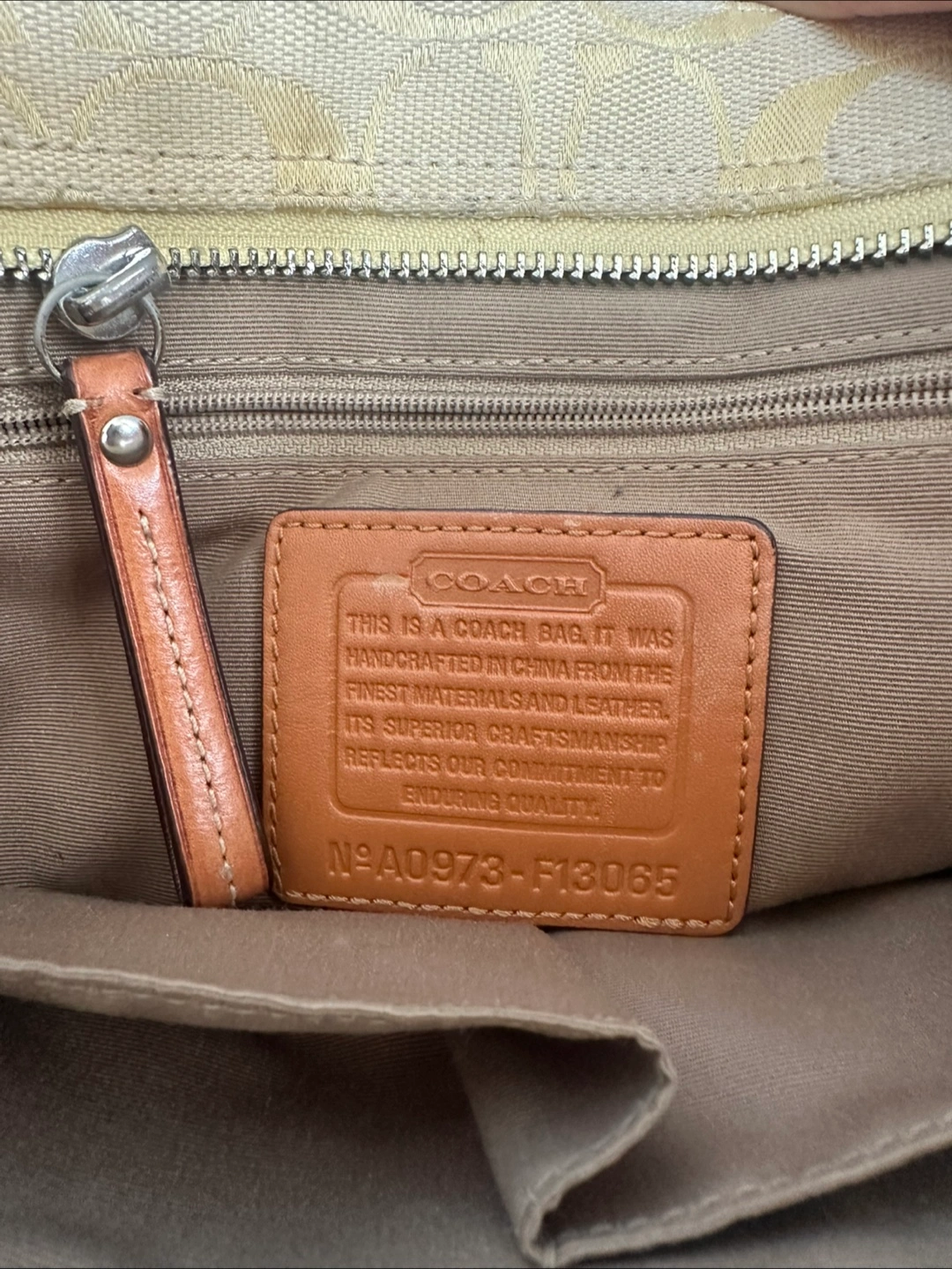 A Coach Hampton Signature C satchel handbag. This yellow jacquard bag has dual rolled leather handles, braided leather trim around the top of the bag, a Coach fob and a center zip closure. The interior is lined in taupe fabric and has a creed patch, marked with the serial number.