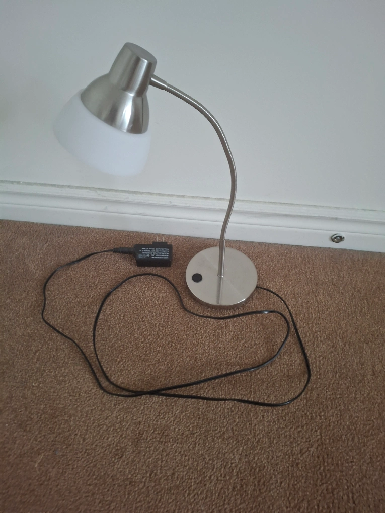 Selling a desk lamp with a silver finish and a flexible gooseneck design. It includes the power adapter. This lamp would be perfect for a desk or bedside table.