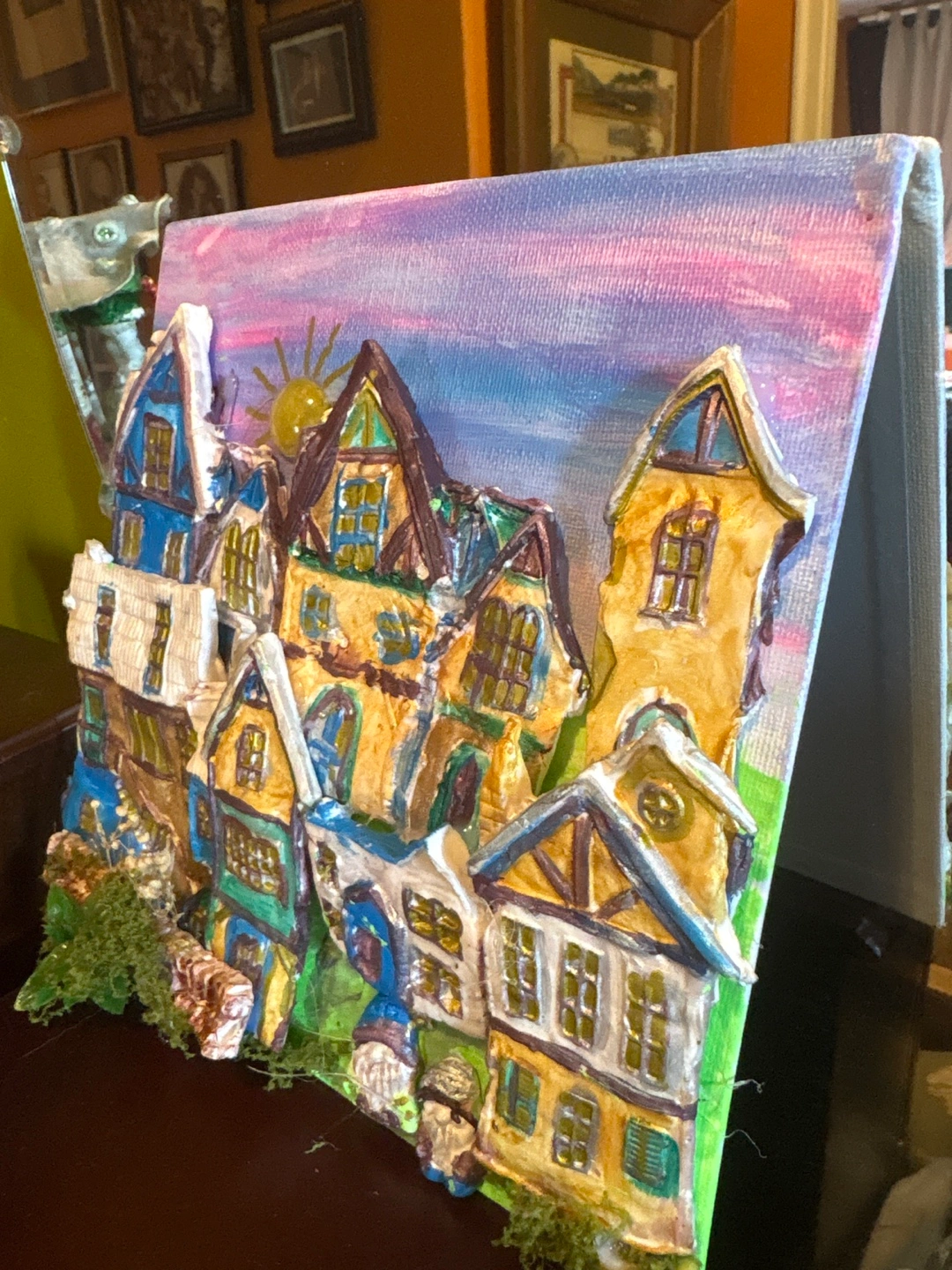 Check out this unique, handmade 3D village scene on canvas! It's a colourful and charming piece of art that would look great in any room. The buildings have lots of detail and the little gnome figures add a whimsical touch :-)