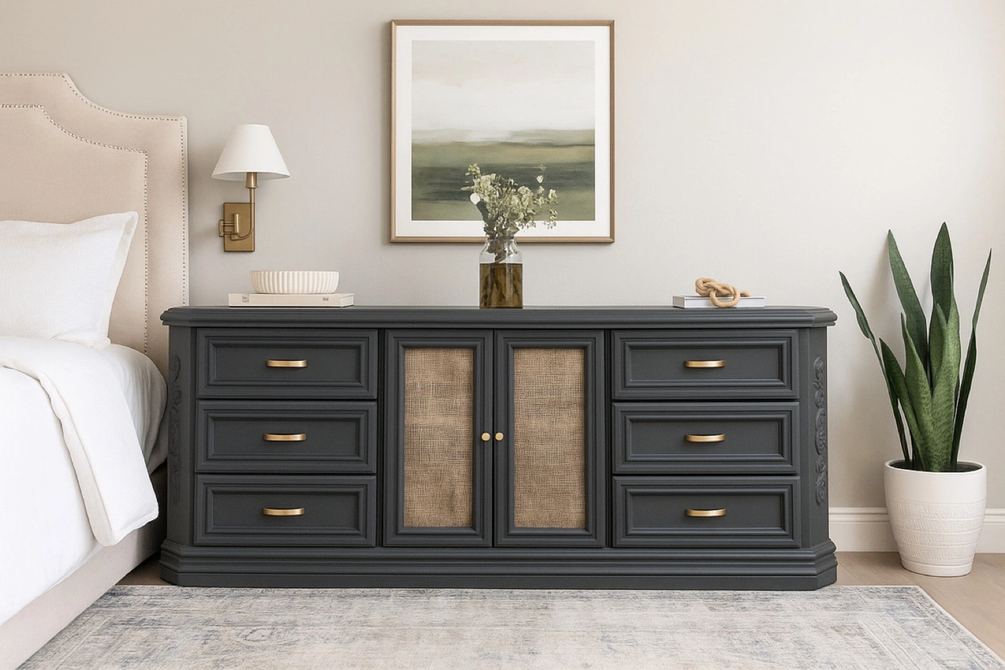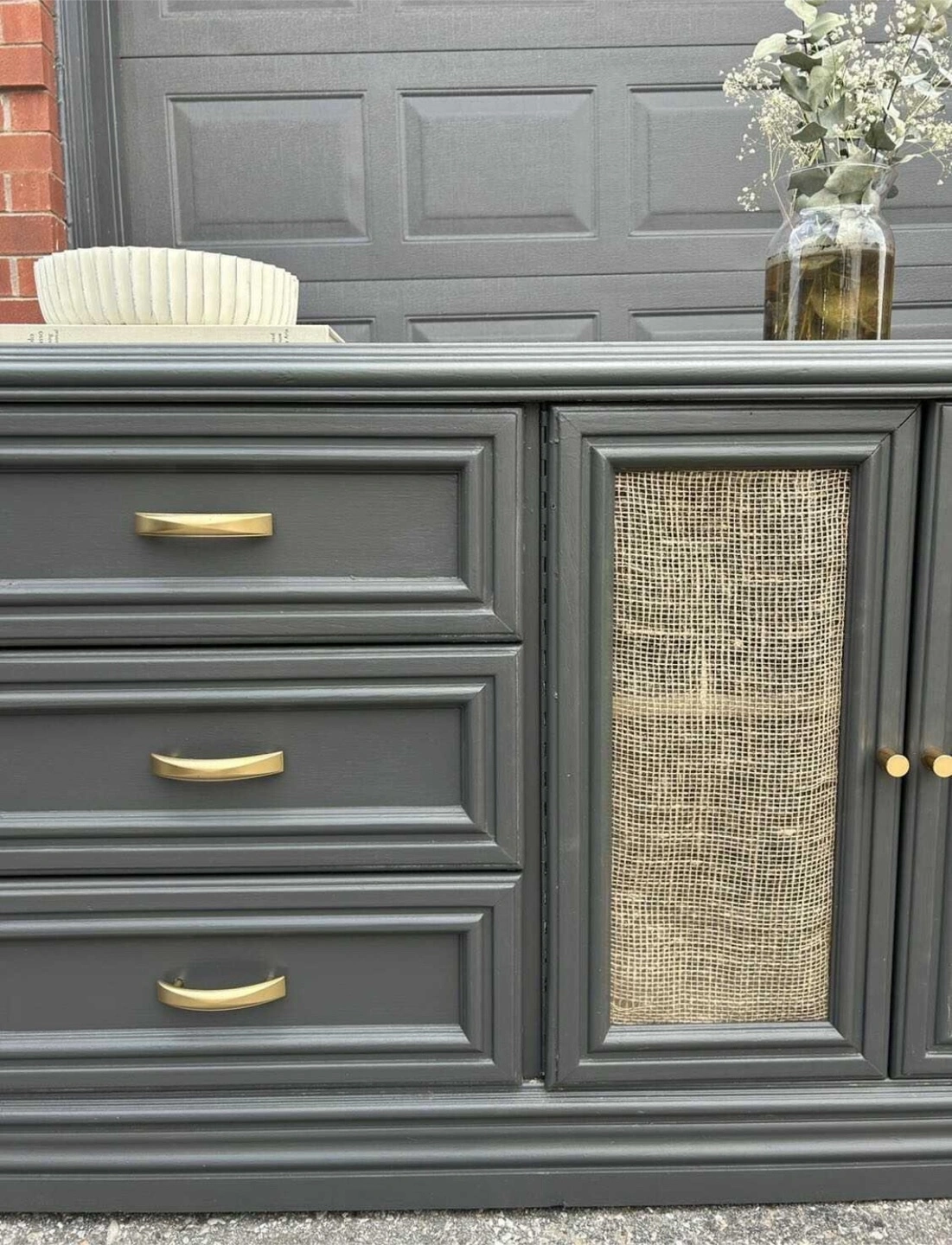 This is a lovely grey dresser, perfect for adding a touch of elegance to any room! It features gold handles and woven door panels. It has several drawers for ample storage space!
