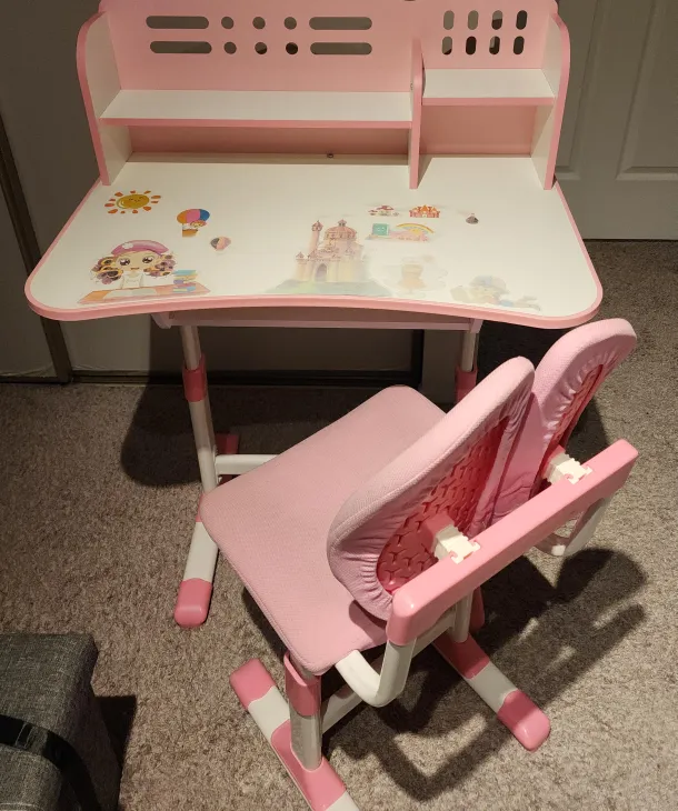 Selling a cute pink desk and chair! It's perfect for a bedroom or play area. The desk features a shelf and fun stickers, and the chair is designed for comfort and good posture. 2 piece Set 41.37*28.57*19.19 inches