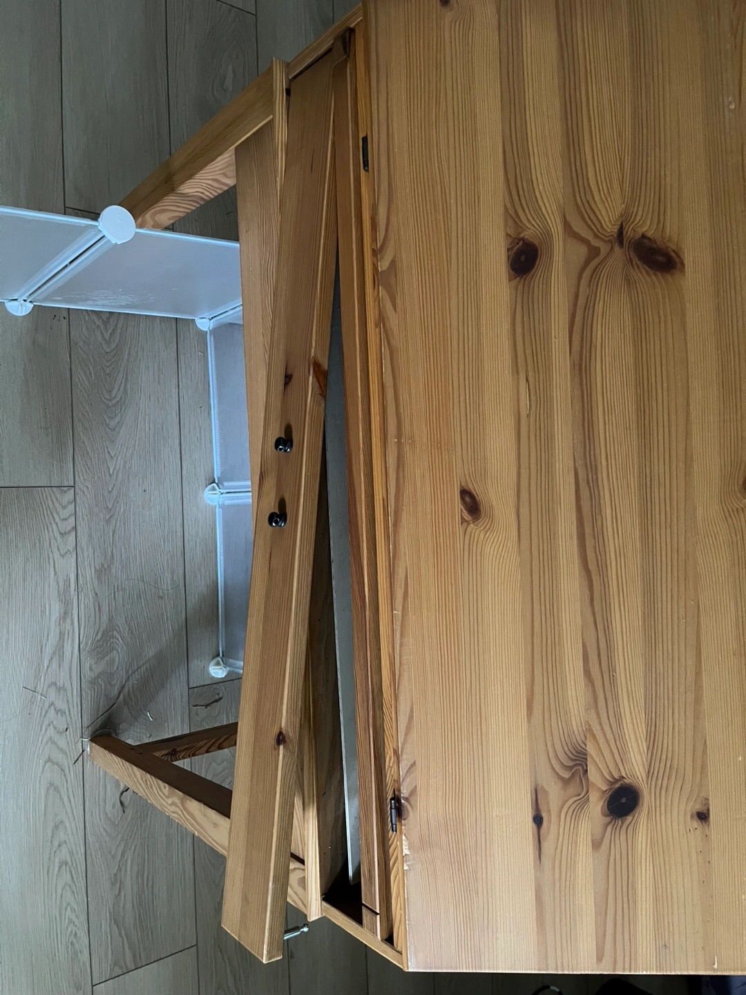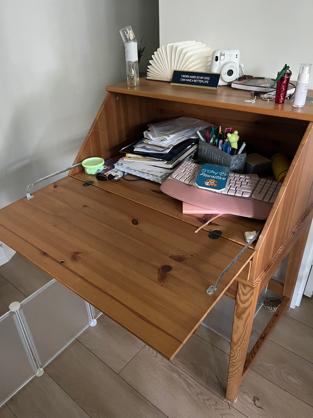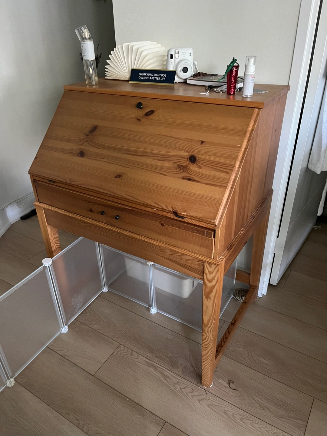 Selling a used secretary desk in solid wood. It's a great piece for a small space, offering both a desk and storage. The desk has a drop-leaf design, perfect for when you need a workspace, and can be closed up when you don't. It shows some signs of use but is still in good condition and ready for a new home the drawer doesn’t open. Other than that works perfectly