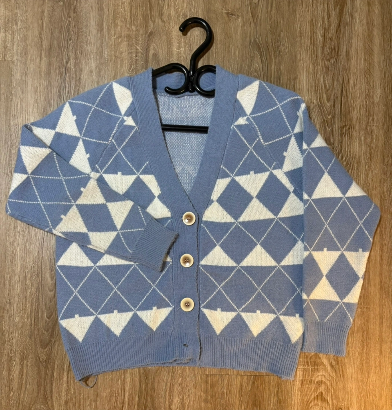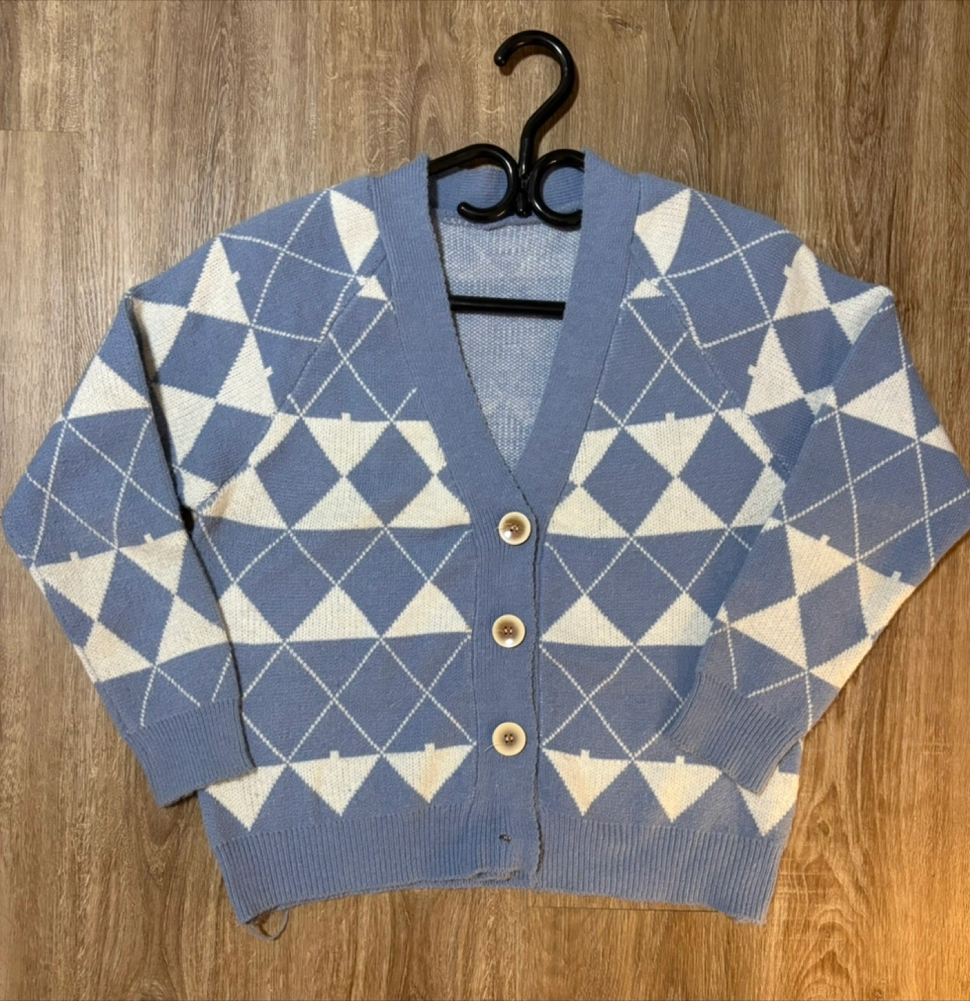 Cute argyle knit cardigan in a light blue and white pattern. It's in great condition and perfect for layering during the cooler months. The material is soft and cozy, making it a comfy addition to any outfit