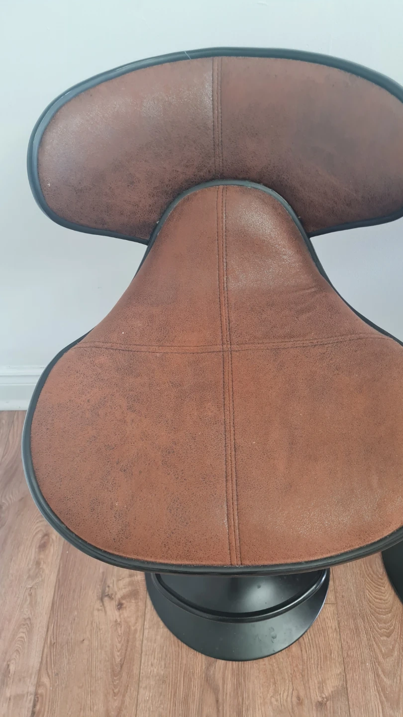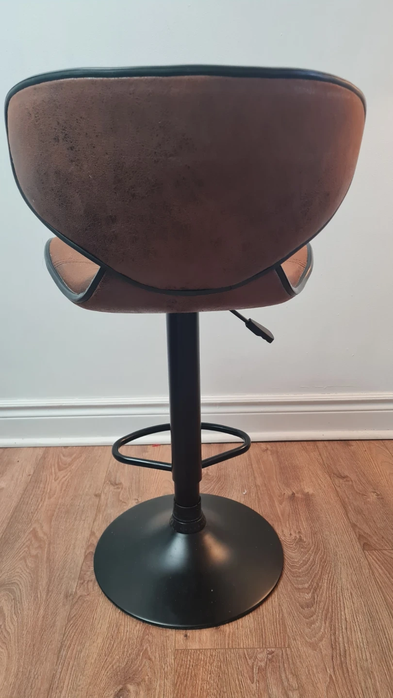 Selling 3 gently used bar stools in a stylish brown seat with a black base. Each stool has an adjustable height with an easy-to-use lever. They are comfortable, versatile, and can complement any space.