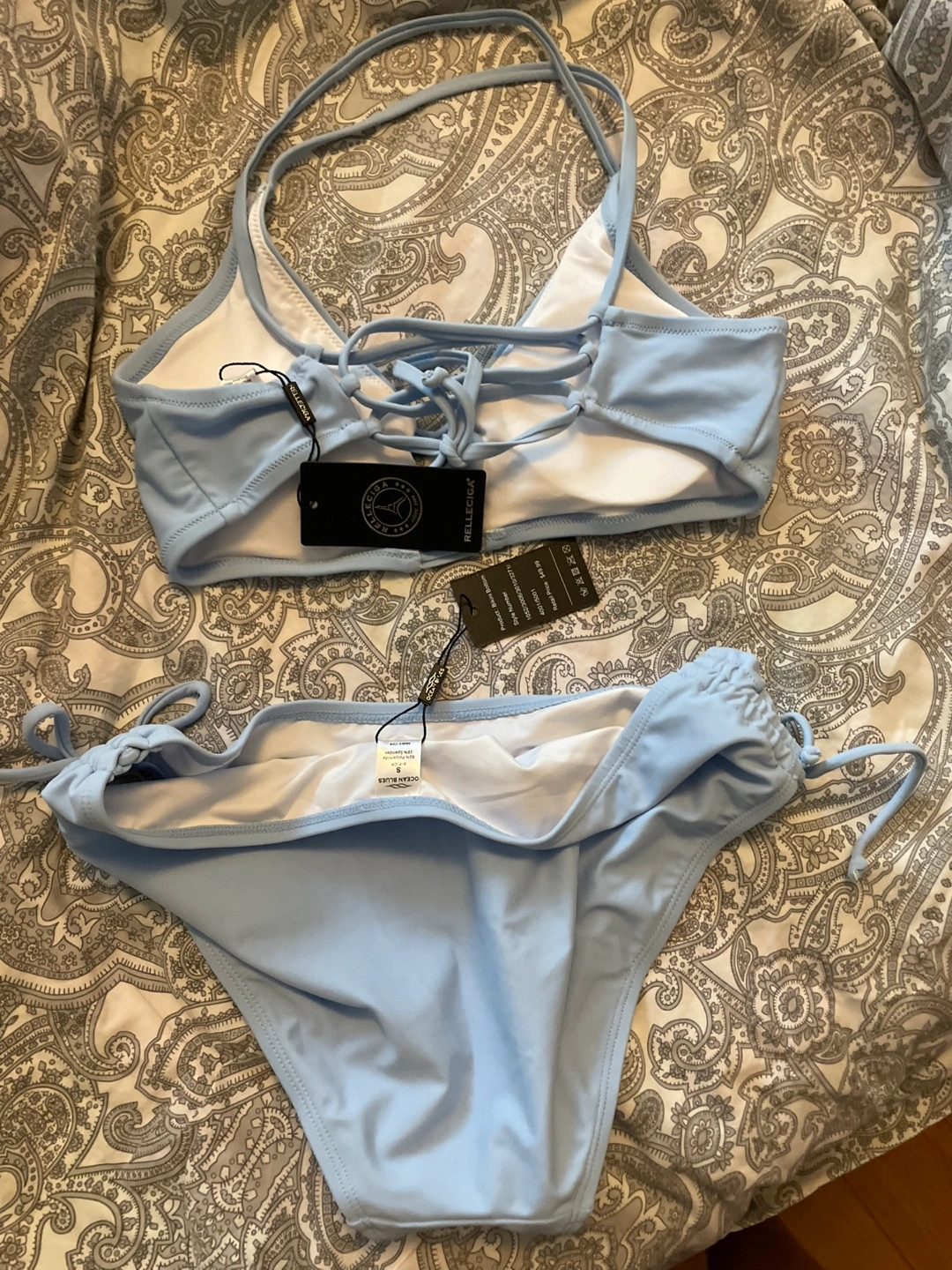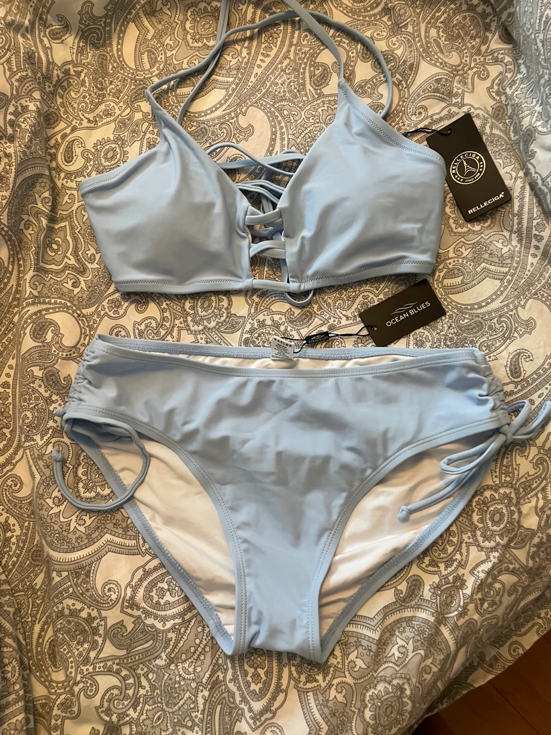 This is a brand new bikini set from Relleciga and Ocean Blues! It's a beautiful light blue colour, perfect for the beach or pool. Never been worn and still has the tags on it.