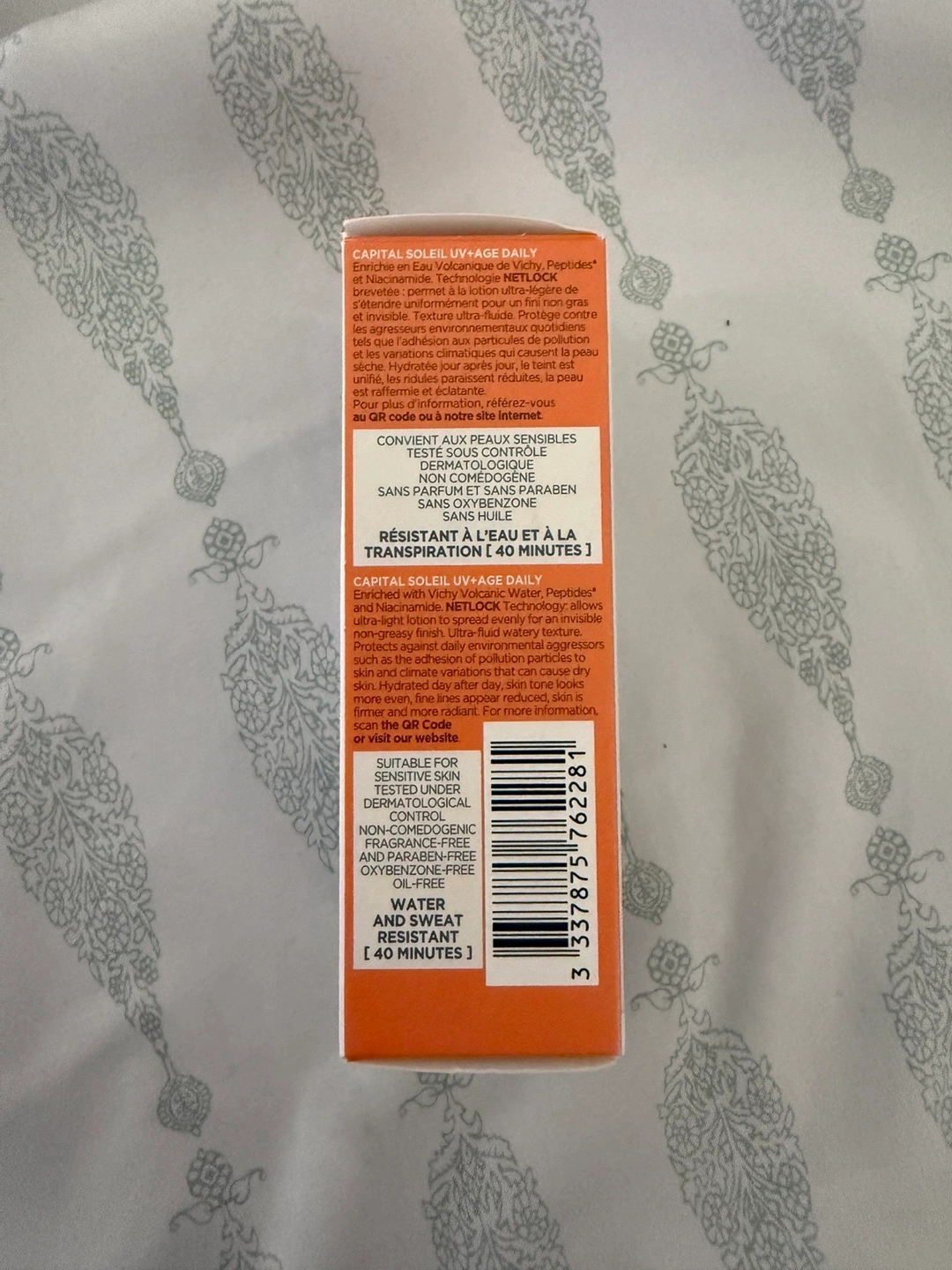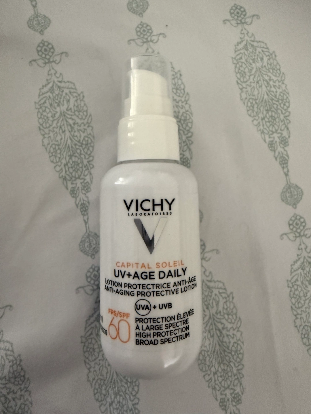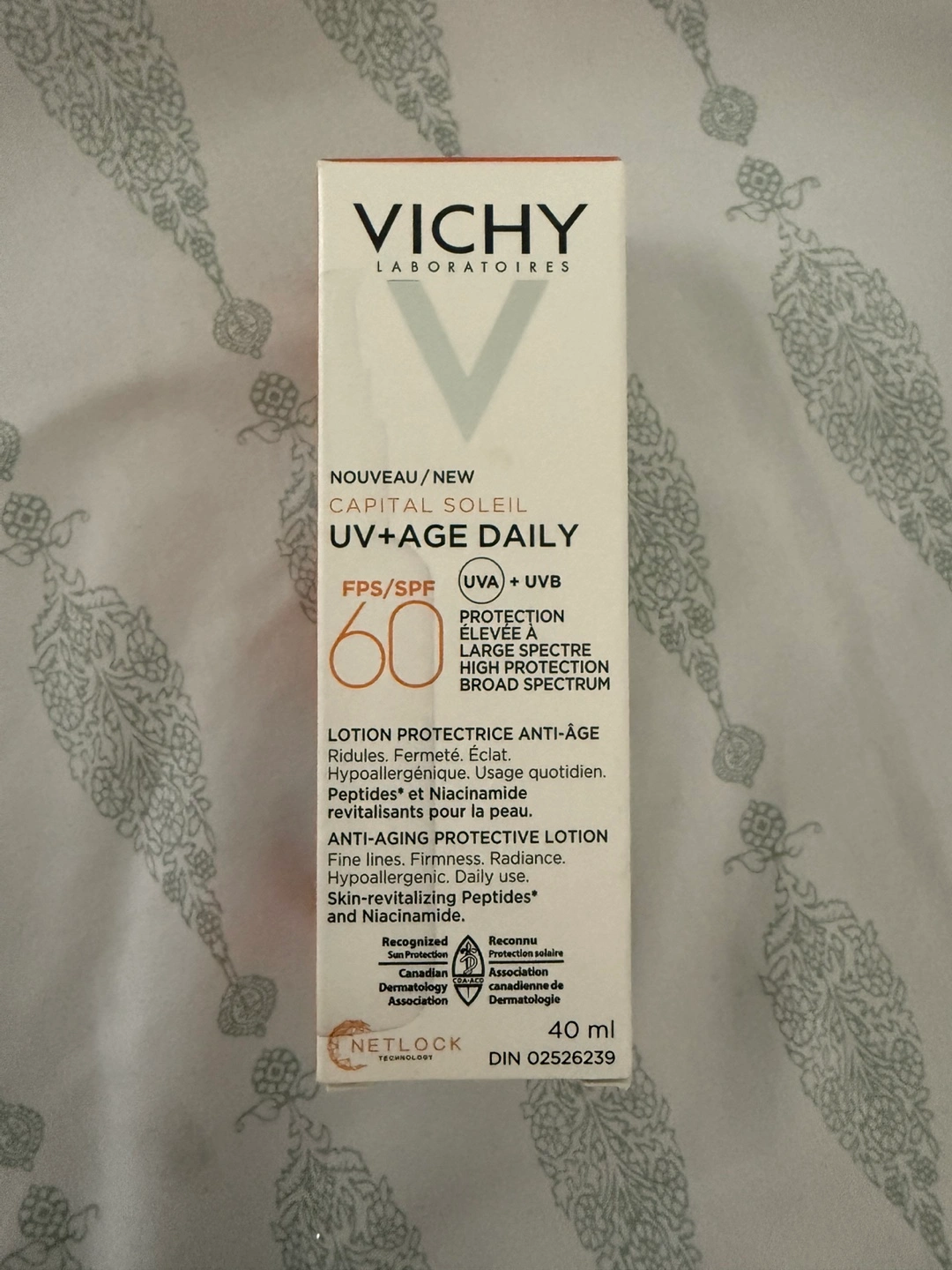 Selling a new bottle of Vichy Capital Soleil UV+Age Daily anti-aging protective lotion with SPF 60. This lotion offers broad spectrum UVA and UVB protection. It's suitable for sensitive skin, hypoallergenic, and oil-free. The bottle contains 40 mL.