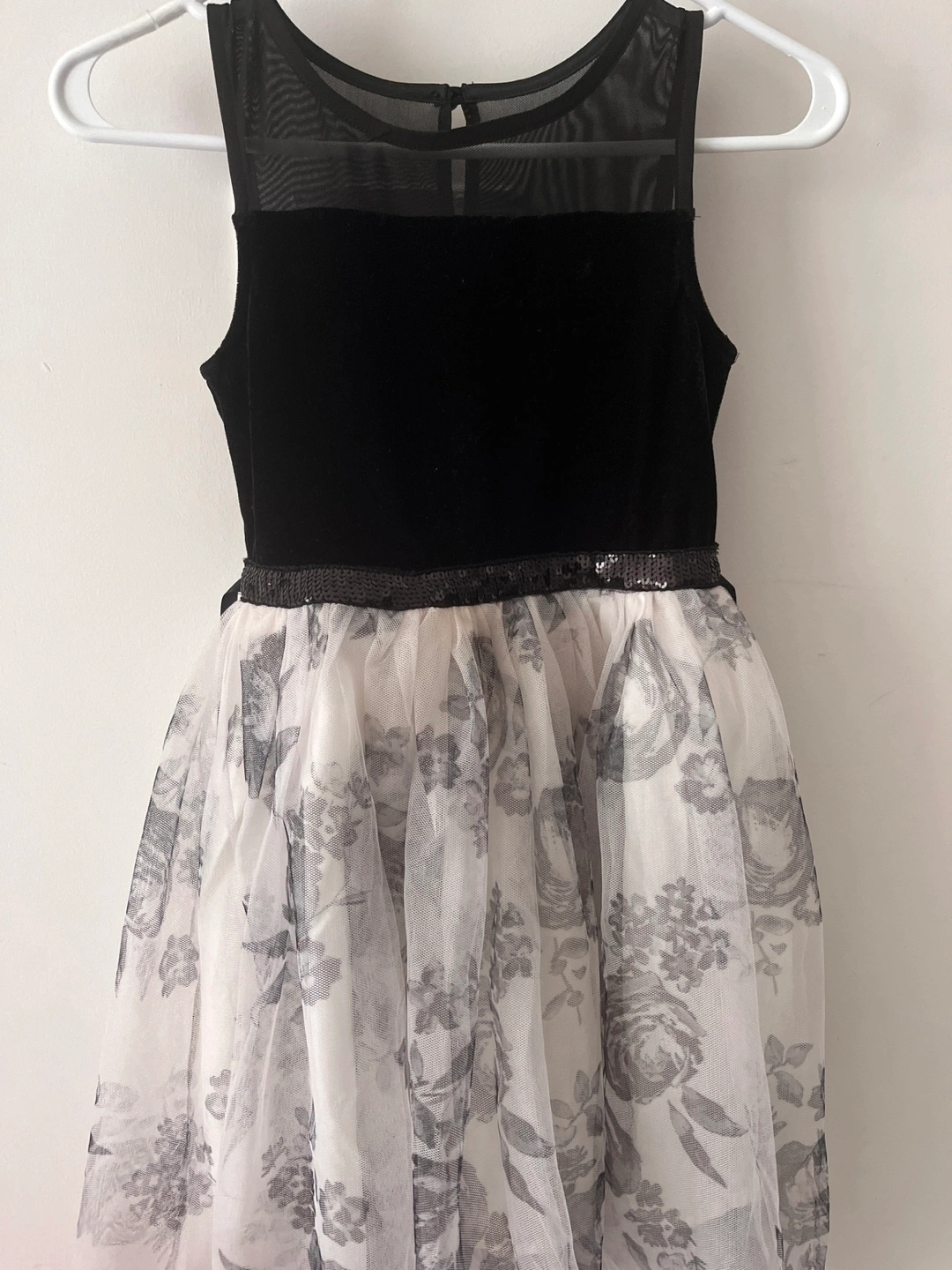 A lovely dress for a special occasion! It features a black velvet bodice and a white floral tulle skirt. Perfect for parties or dressing up!