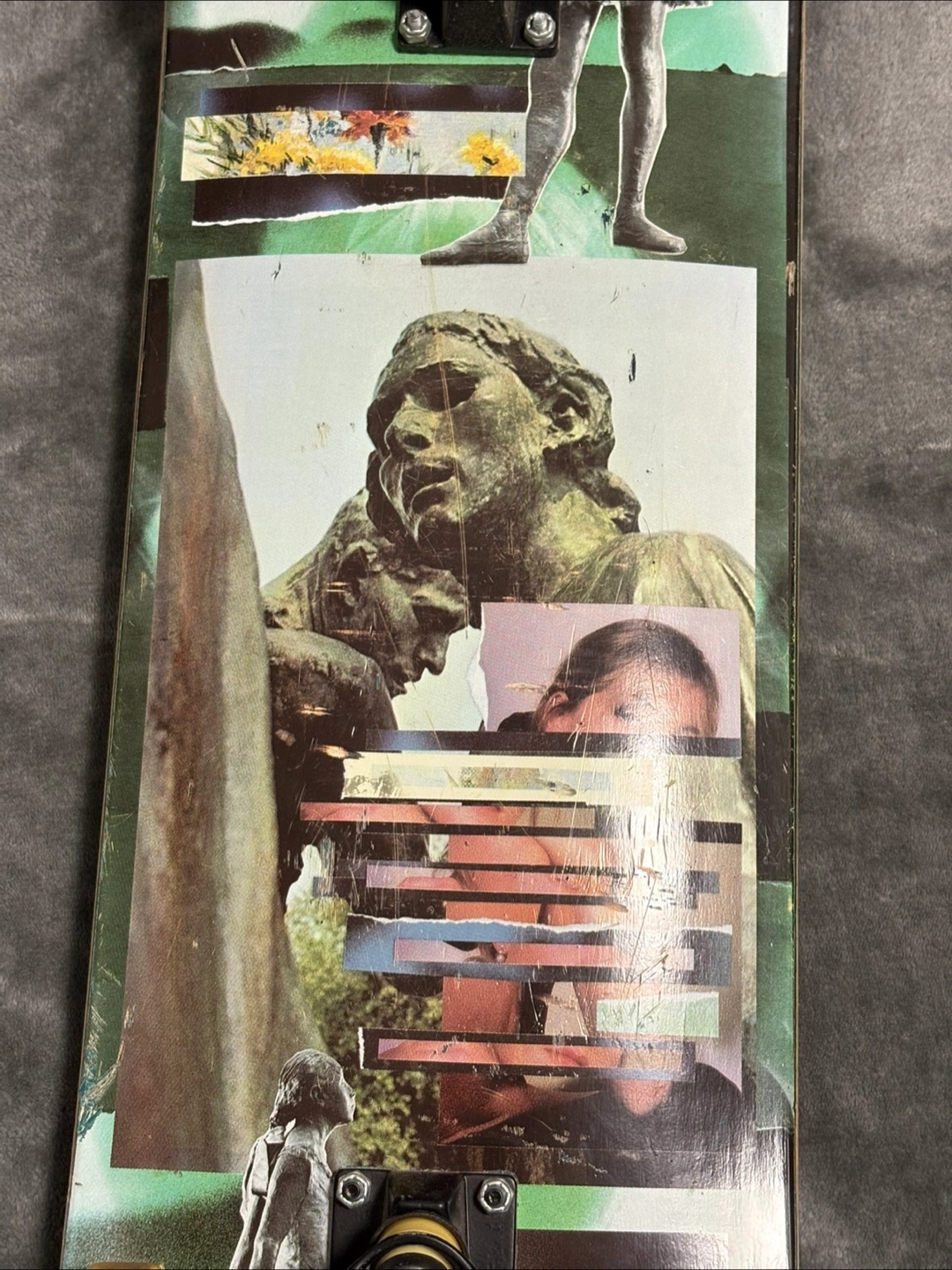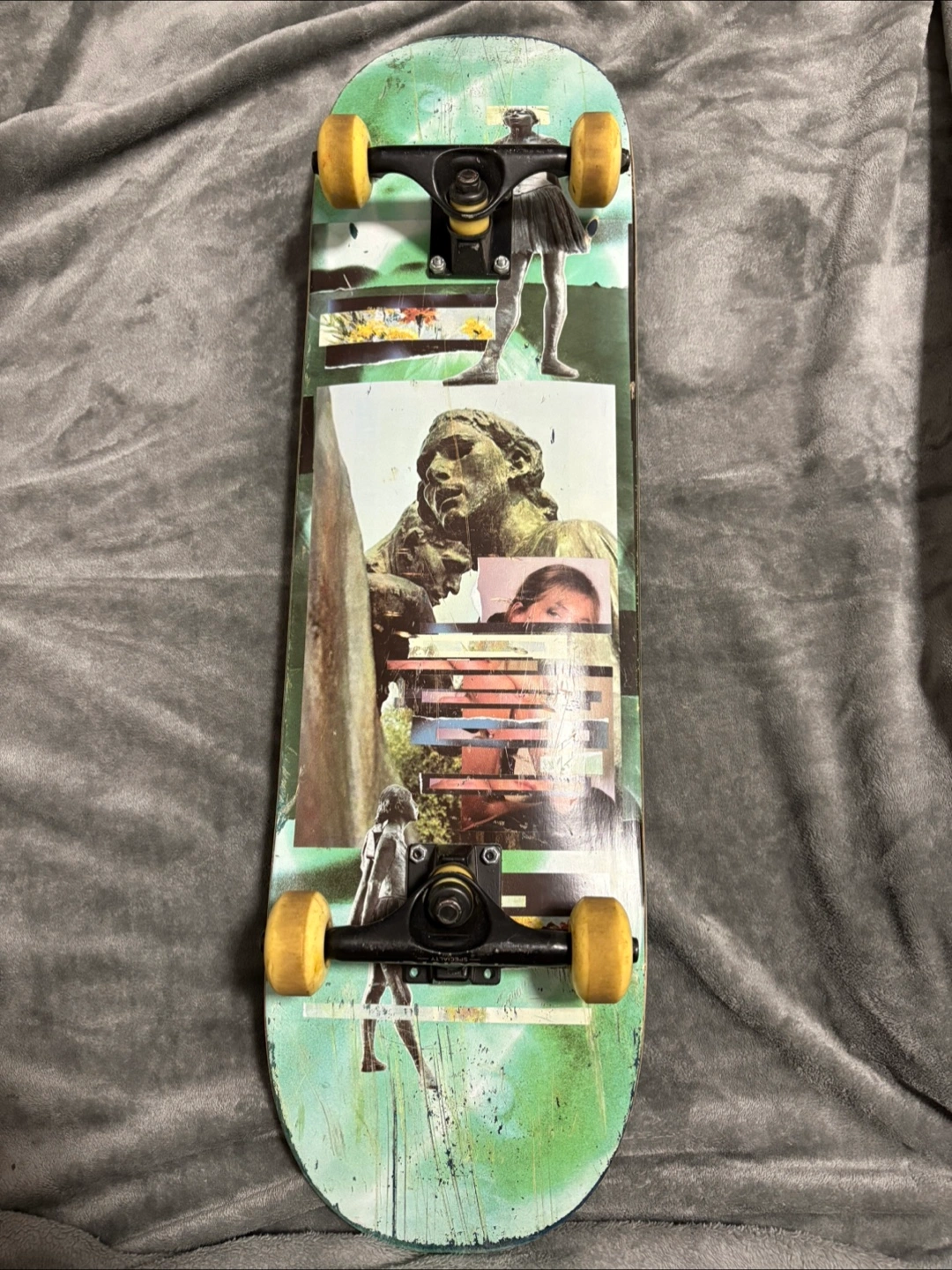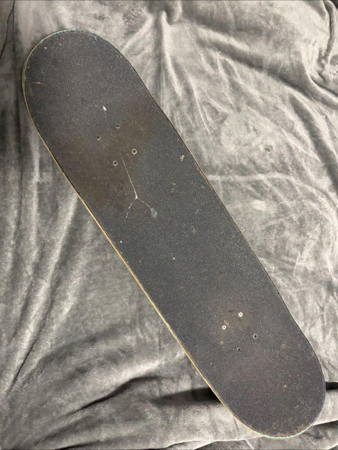 Selling a used skateboard. It has some wear and tear, but it's still in good working condition. It is 8.5 inches and it’s great for someone looking to start skateboarding or for someone who needs a spare board.