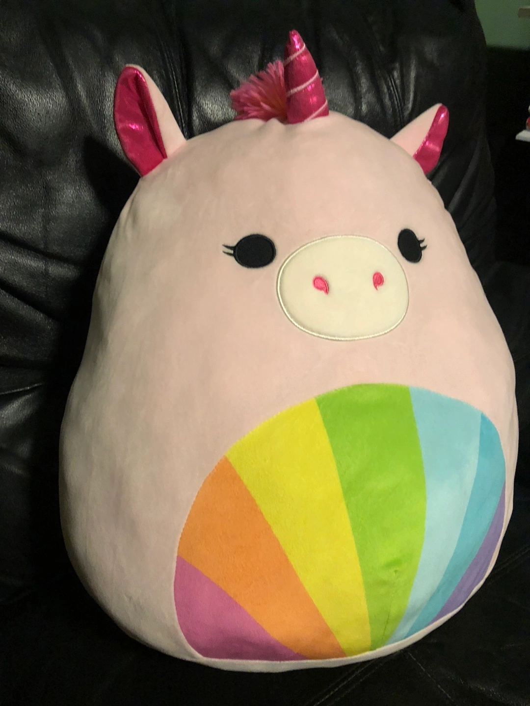 ONLY $4!!! Looking to add a super cuddly friend to your collection? This Squishmallows unicorn plush is perfect! It's in great condition and ready for a new home. The soft material and rainbow belly make it a delightful addition to any room