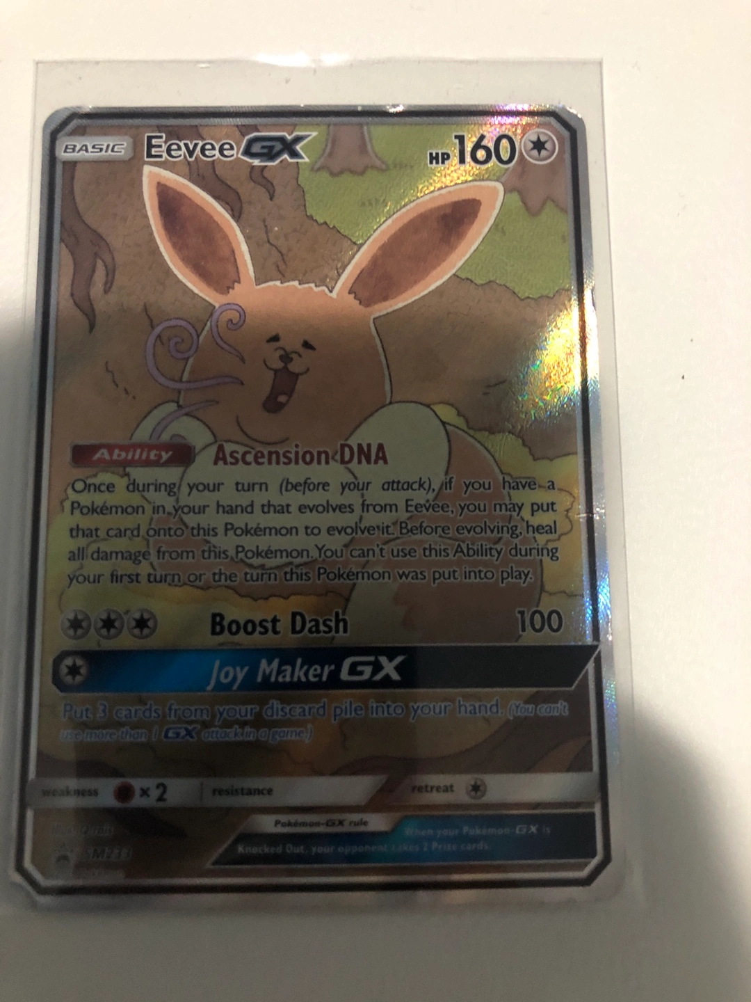 262Selling an Eevee GX Pokemon card. It's in great condition and ready for a new home! Feel free to reach out if you're interested