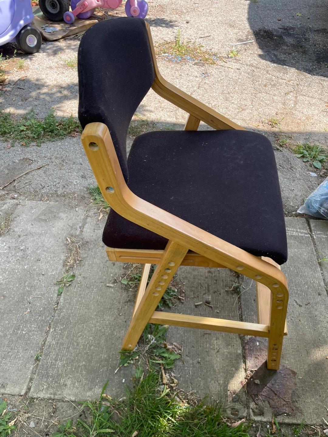 Chair with a wooden frame and black fabric seat and back. It's perfect as extra seating when you have guests or for small spaces where you need a chair that can be easily stored. It's in good condition and ready to use.