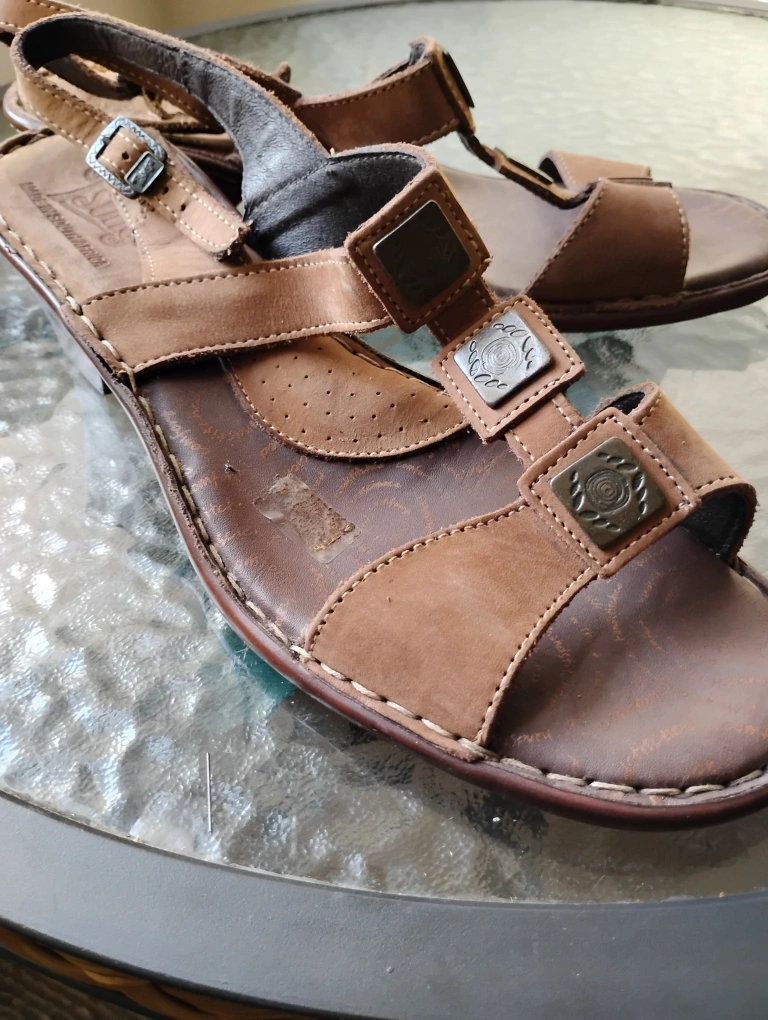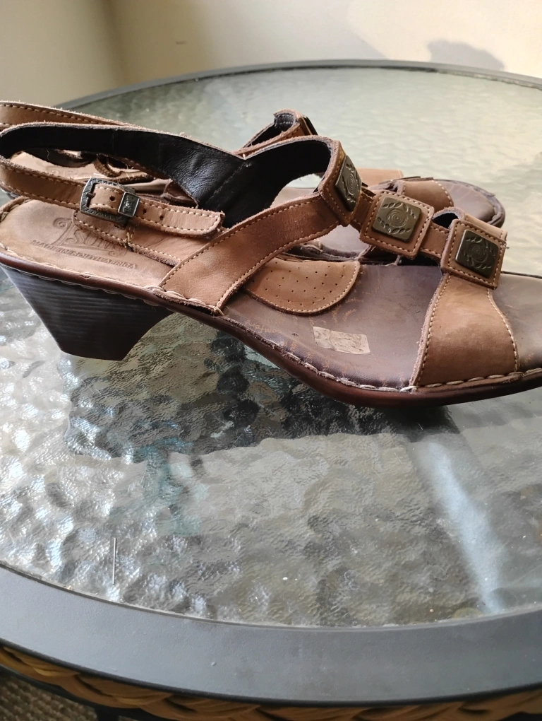 These Tsonga sandals are handmade in Africa with a thread of hope. They are brown leather sandals with buckle straps and a unique design. Worn once