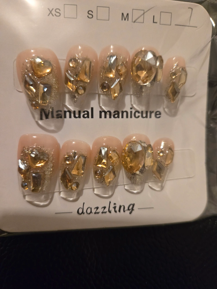 Selling a set of dazzling press-on nails for a manual manicure! These are perfect for adding some sparkle to your look. They come in a set with various sizes to fit different nail beds. Get ready to shine!