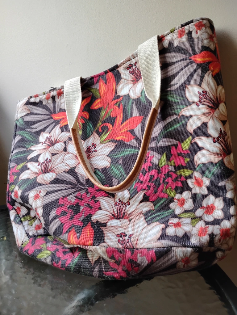 This tote bag features a vibrant floral print with a mix of white, red, and pink flowers against a darker background. It has sturdy white handles and a faux leather trim around the top edge..Is brand new unused.