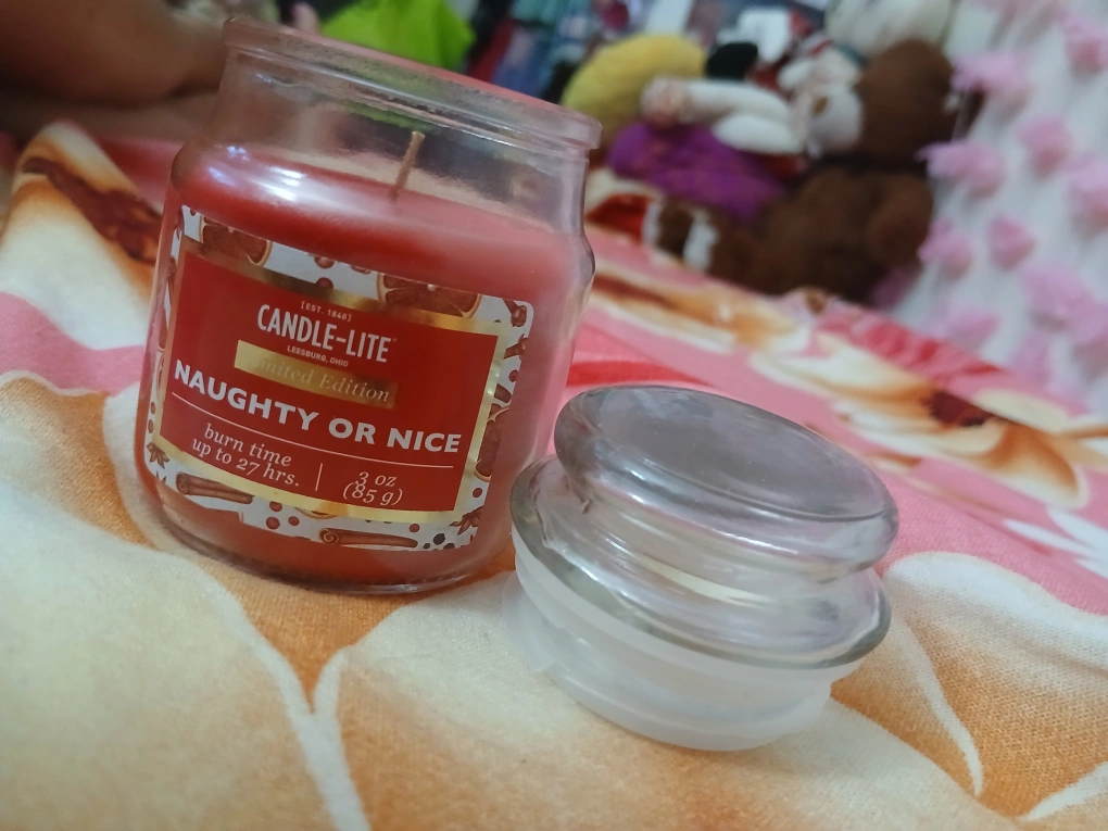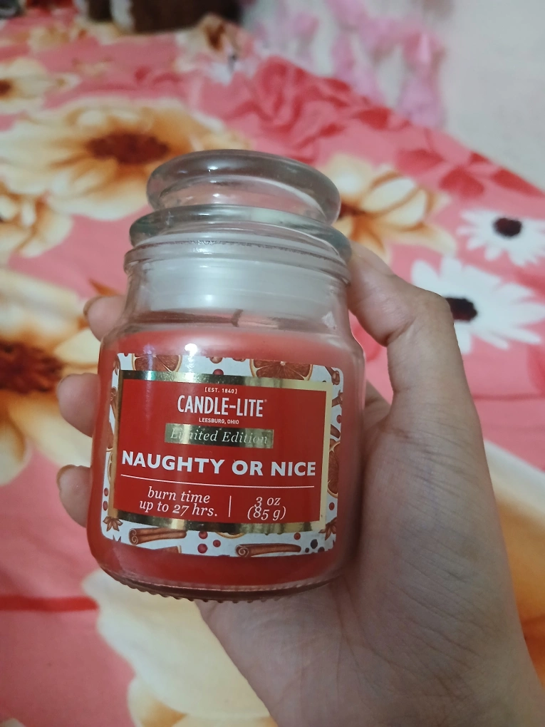 Cinnamon and orange scented candle Selling a Candle-Lite Limited Edition candle. It's the 'Naughty or Nice' scent and has a burn time of up to 27 hours. The candle is 3 oz (85 g).