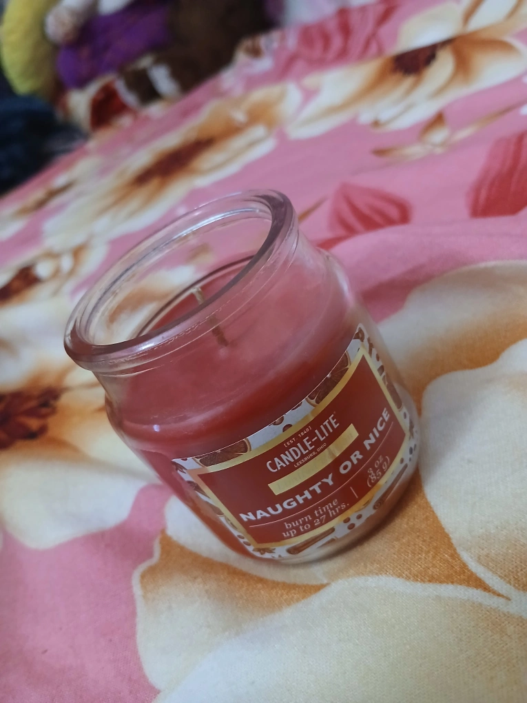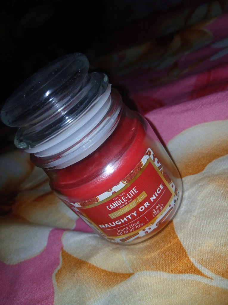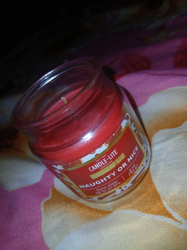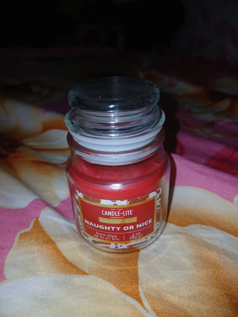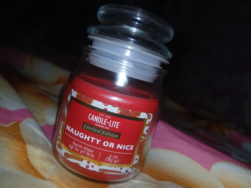 Cinnamon and orange scented candle Selling a Candle-Lite Limited Edition candle. It's the 'Naughty or Nice' scent and has a burn time of up to 27 hours. The candle is 3 oz (85 g).